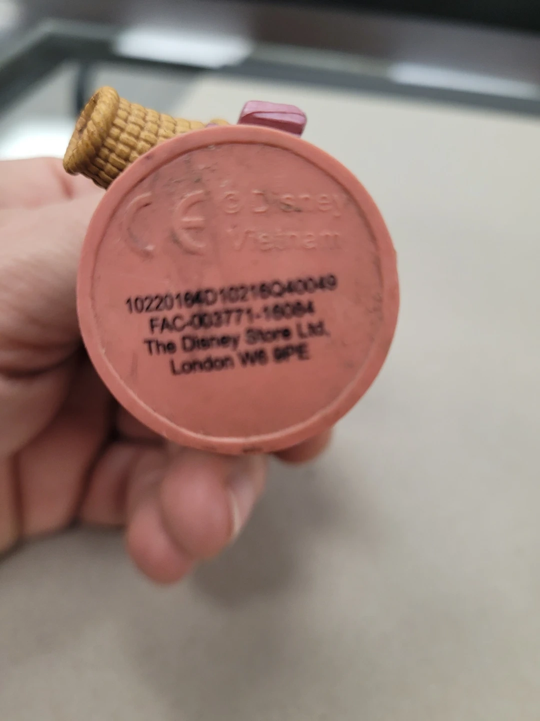 This is a Disney Aurora figurine holding a small woven basket. The figurine is detailed and depicts the character in her classic gown. It's made of durable material and stands on a pink base. This would be a sweet addition to a collection!