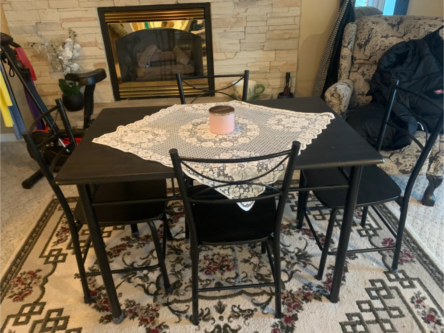 A black dining table set with four chairs. The table has a dark finish and metal legs. The chairs are also black with metal frames and curved backs. This set is suitable for a small dining area or kitchen nook. It's a functional addition to any home! No marks or scratches. Pick up only.