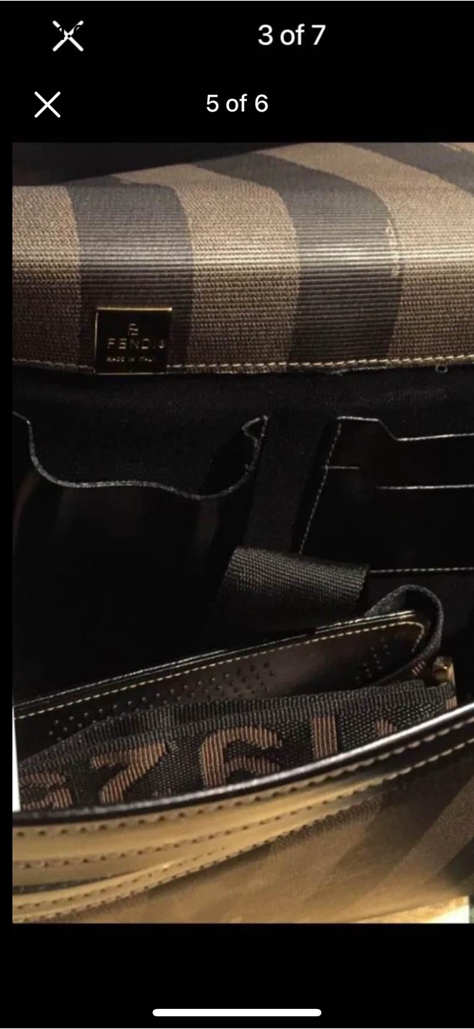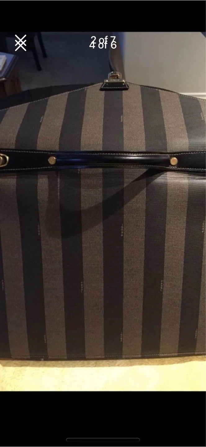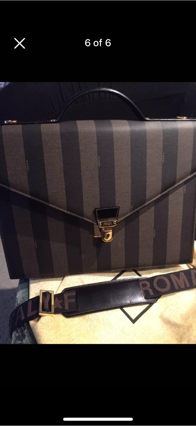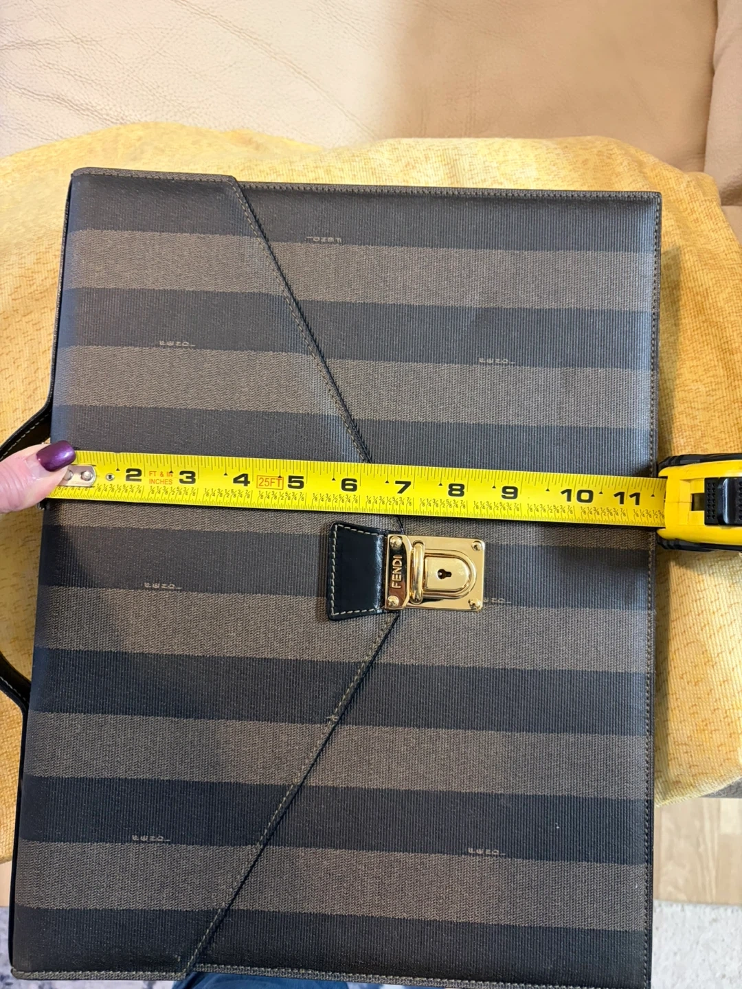 Vintage Fendi briefcase in classic brown and black monogram stripe. It's made of durable coated canvas with leather trim and features a secure lock closure. Comes with an adjustable shoulder strap for versatile carrying, key and lock. Includes dust cover.