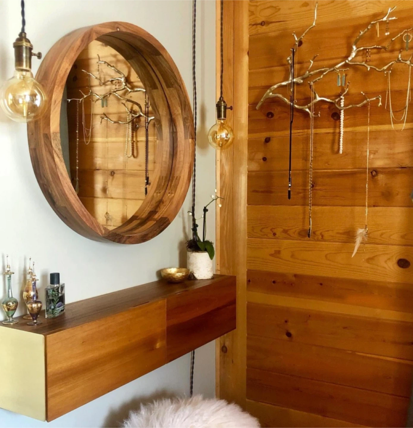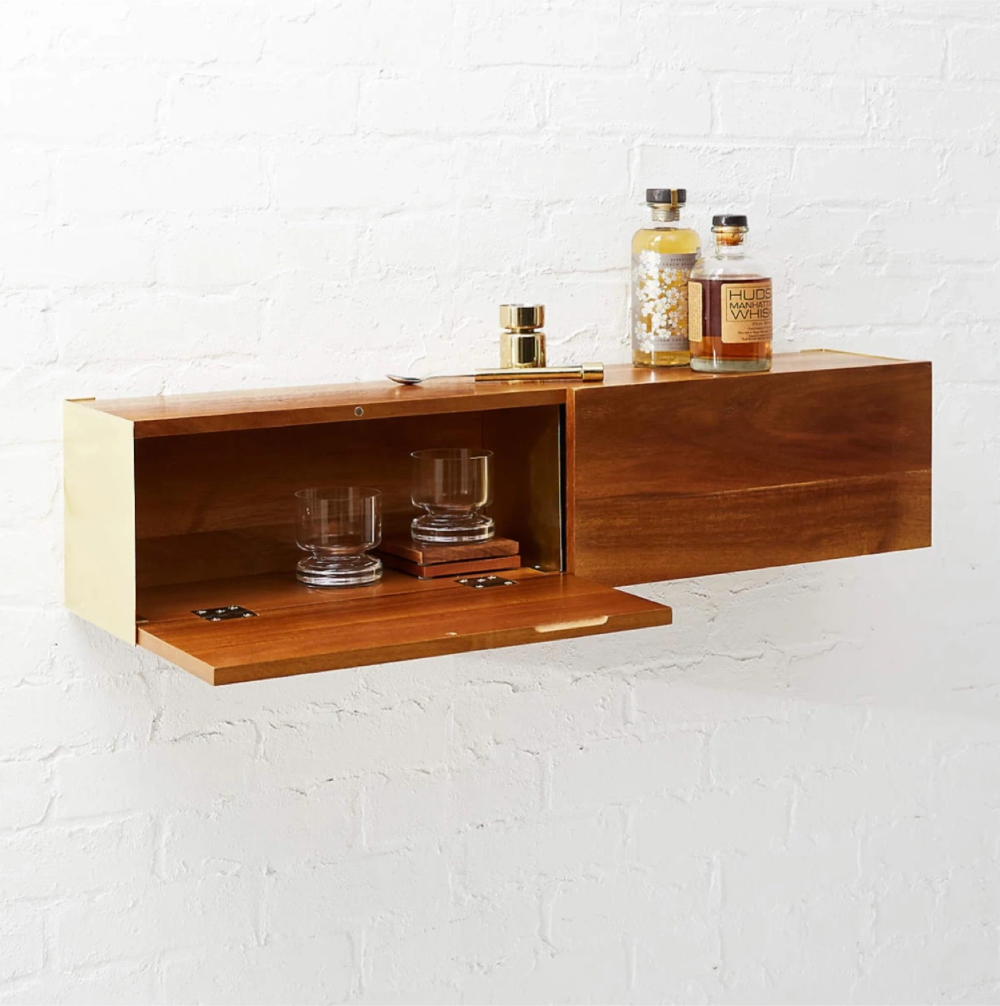 Warm acacia wood double doors flip to surprise brass walls inside this smart shelf by Diana Lu of Slate Design. Use solo, stacked or ganged down the wall. Great storage solution to free up floor space in dining, entry, hallway, bath, bedroom.