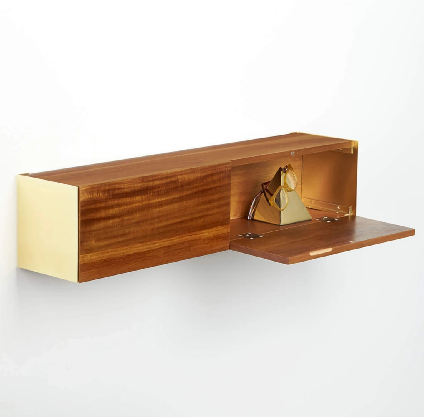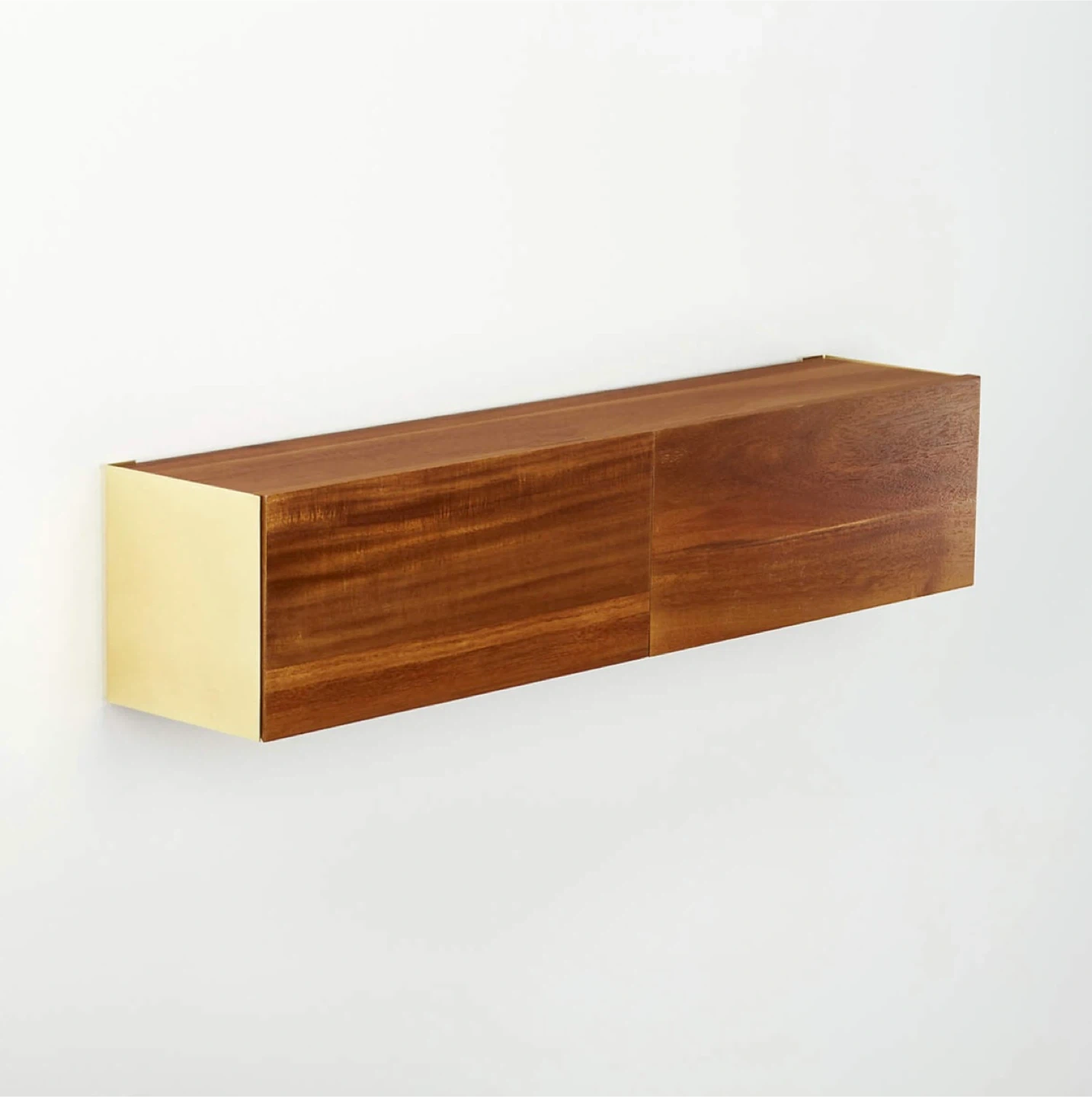 Warm acacia wood double doors flip to surprise brass walls inside this smart shelf by Diana Lu of Slate Design. Use solo, stacked or ganged down the wall. Great storage solution to free up floor space in dining, entry, hallway, bath, bedroom.