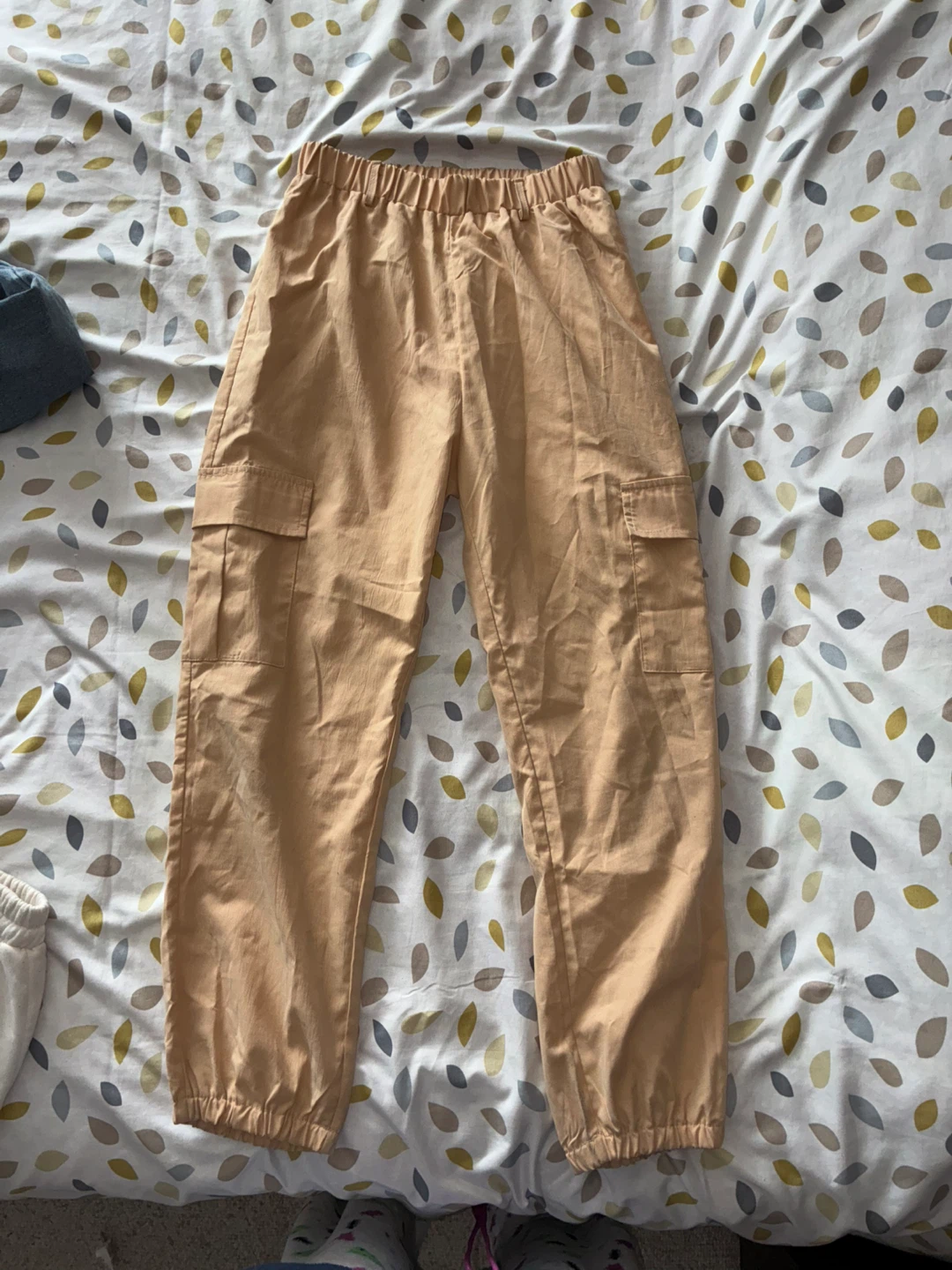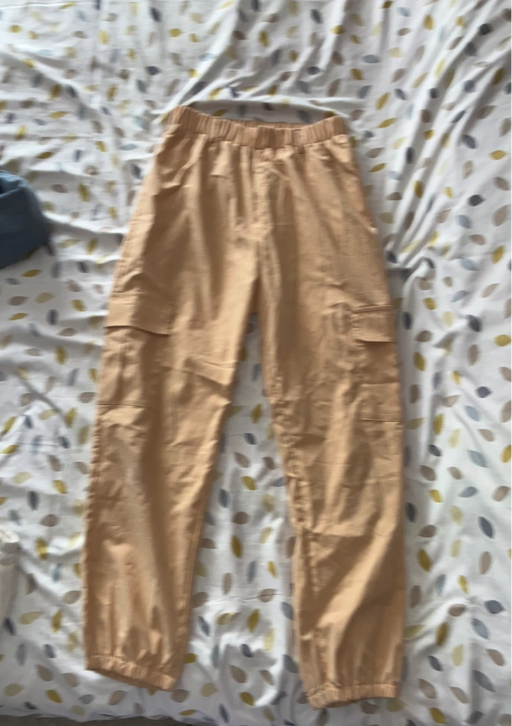 These beige cargo pants are a stylish and practical addition to any wardrobe. They have an elastic waistband for a comfortable fit and two cargo pockets on the legs. Material is a lightweight cotton blend.