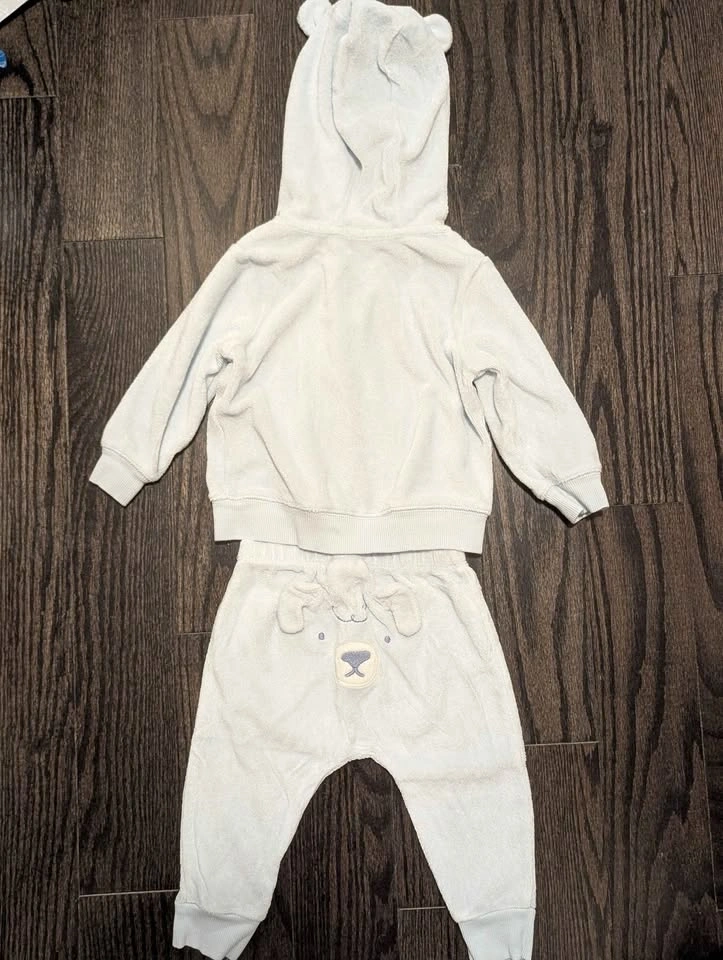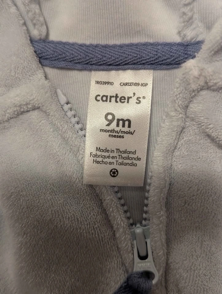 Carter’s baby outfit, size 9 months. Light blue hoodie with dog ears and matching pants with a dog face on the back. Full zip hoodie for easy dressing. Excellent condition.