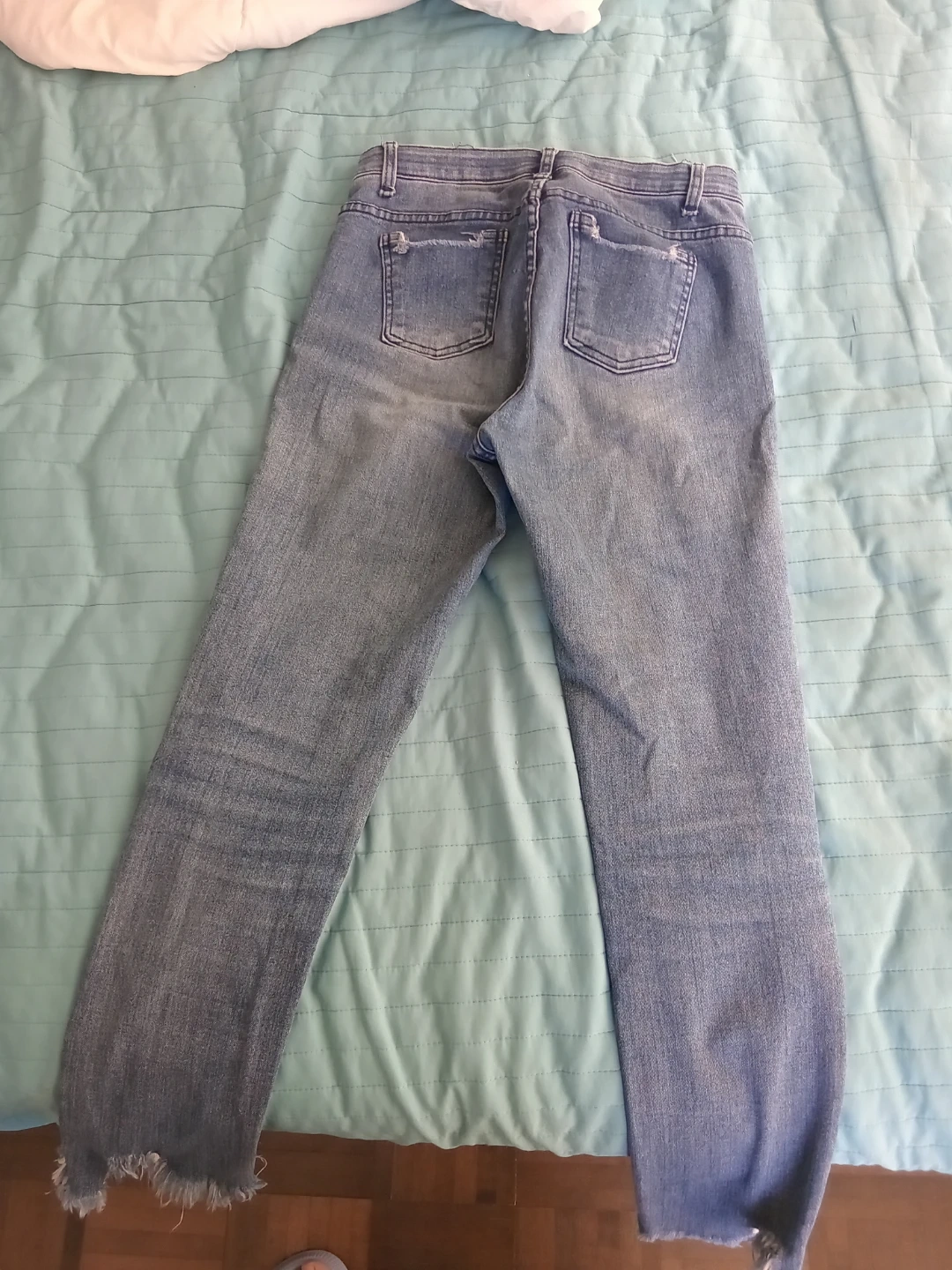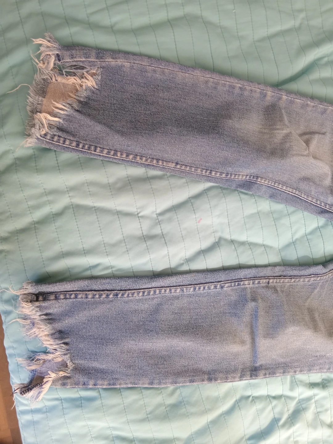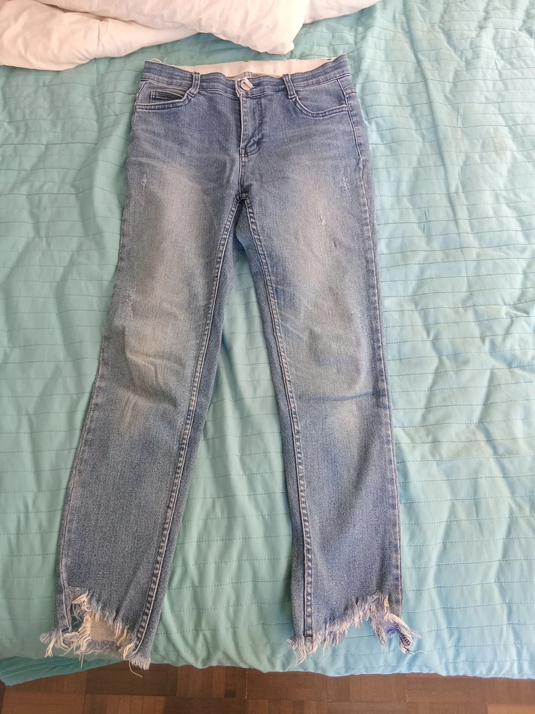Light wash denim jeans with a distressed look. Features ripped details and frayed hems. These jeans have a modern, casual style.