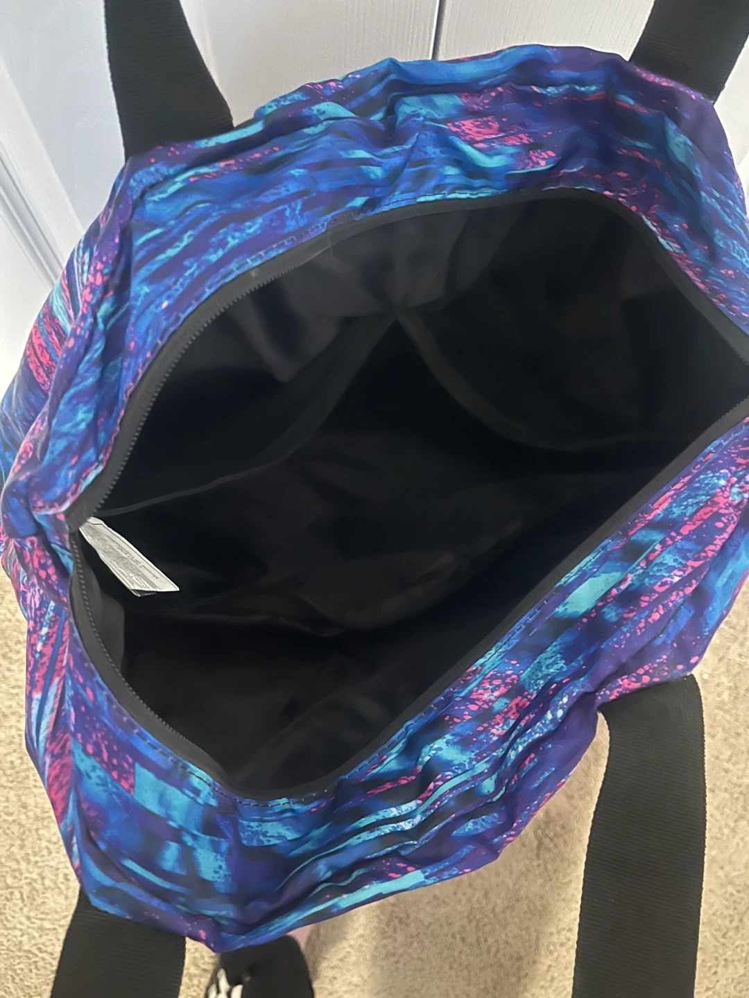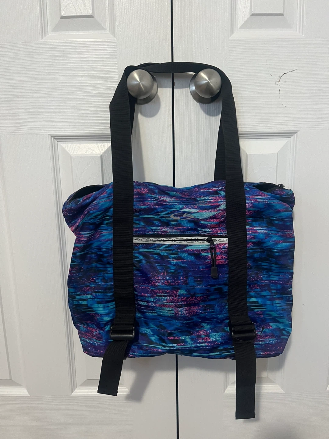 This multi-purpose tote bag has a vibrant abstract print in blues and pinks. It features a main zippered compartment with internal pockets. The bag can be carried as a tote or worn as a backpack!