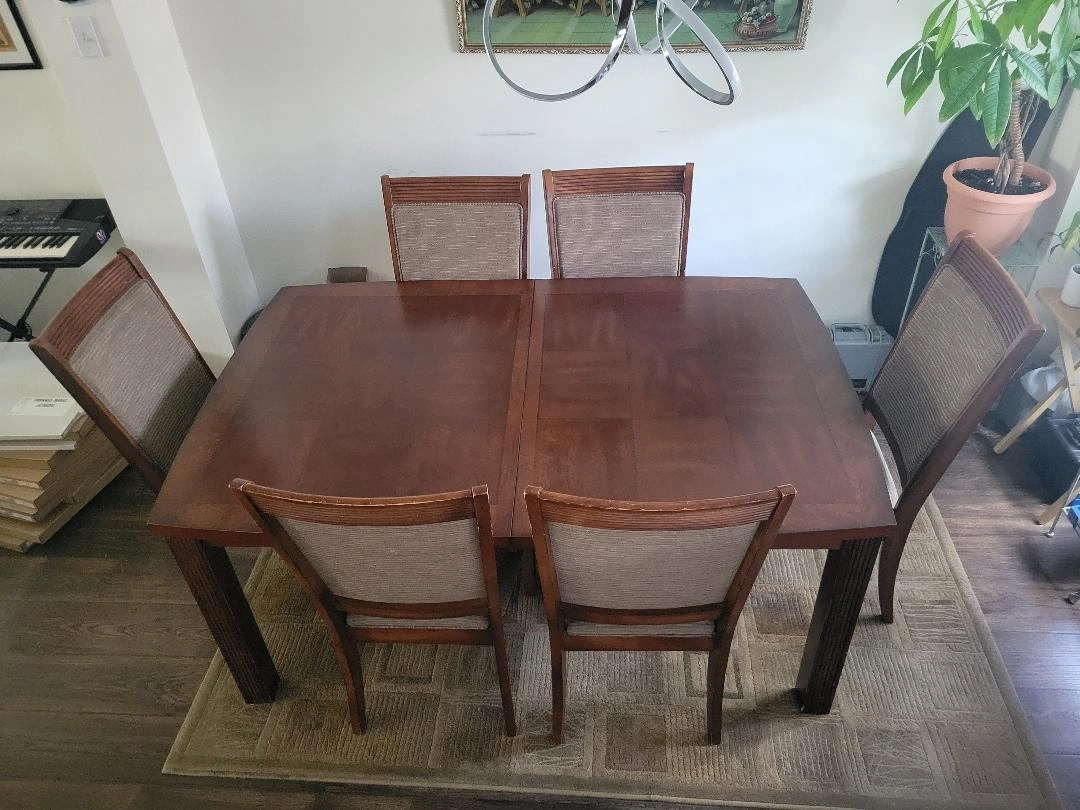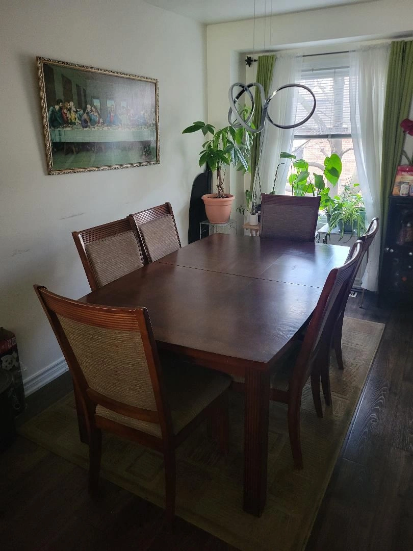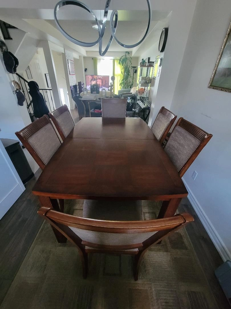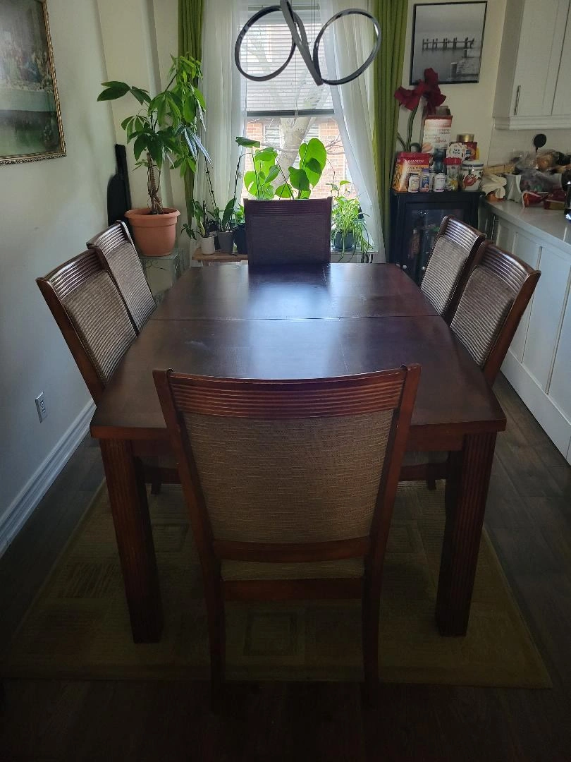 Selling a beautiful dark wood dining table set in great condition. Perfect for family meals, hosting friends, or everyday use.