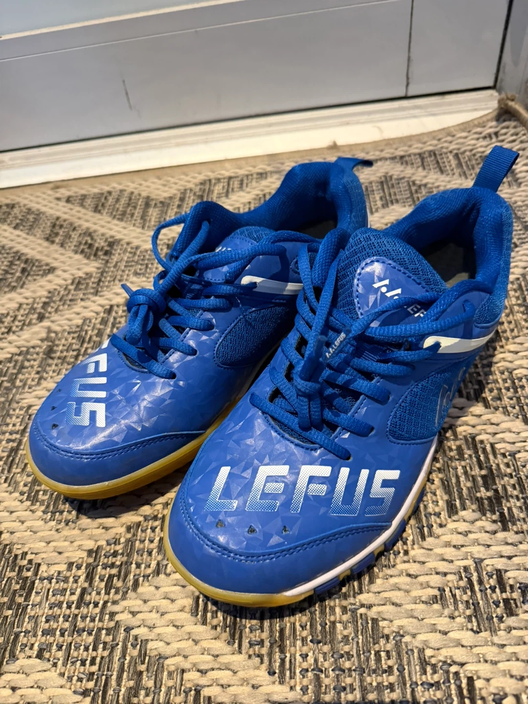 LEFUS blue athletic shoes with a CN42 size. These shoes have a mesh and synthetic upper with a rubber sole. They're designed for athletic activities.