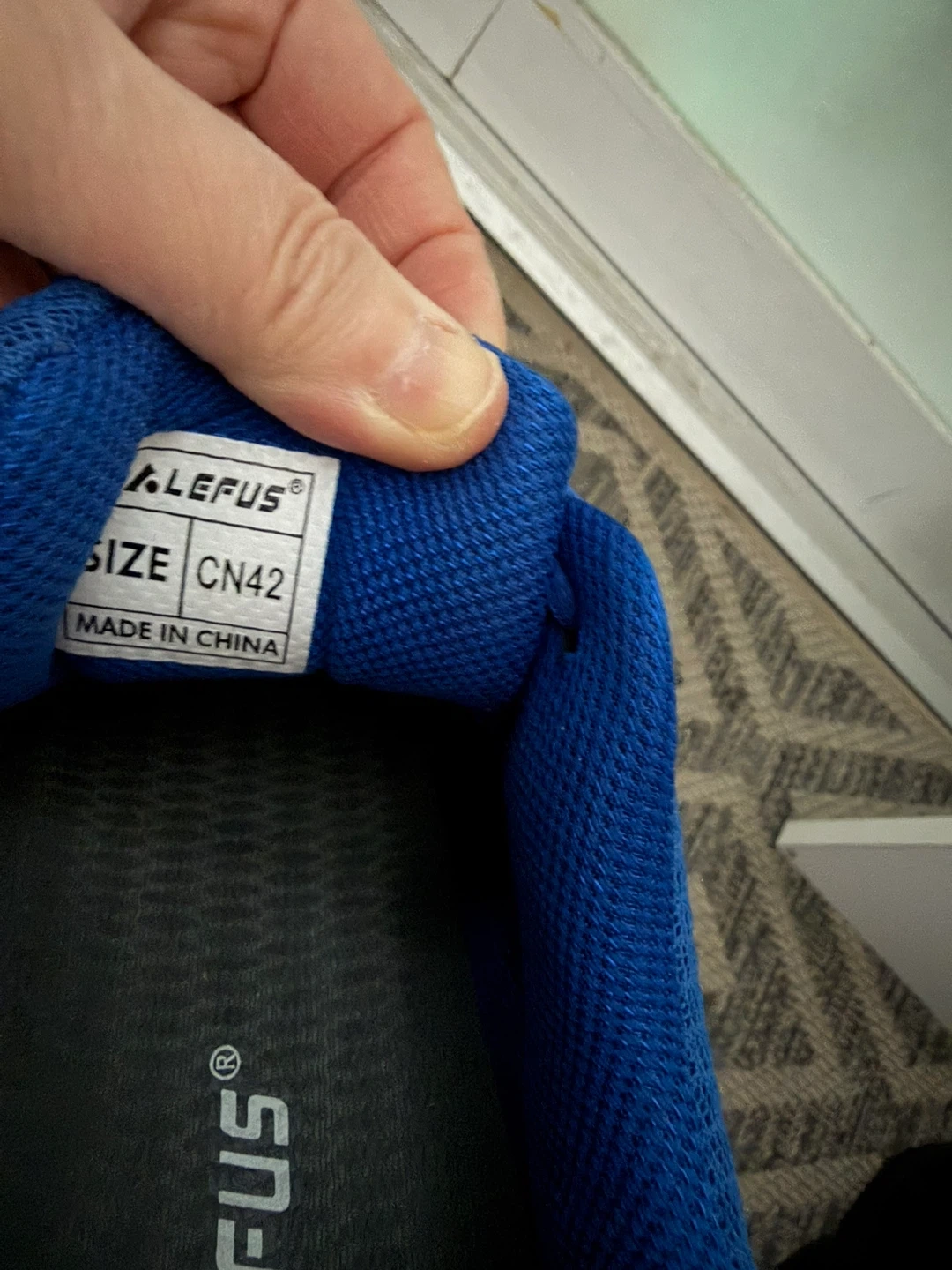 LEFUS blue athletic shoes with a CN42 size. These shoes have a mesh and synthetic upper with a rubber sole. They're designed for athletic activities.