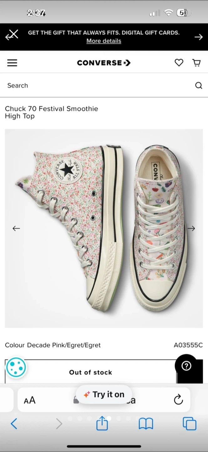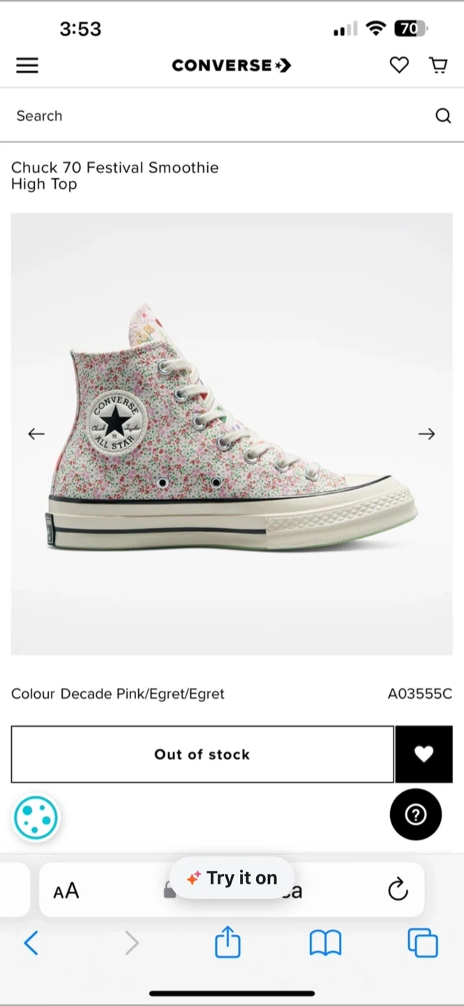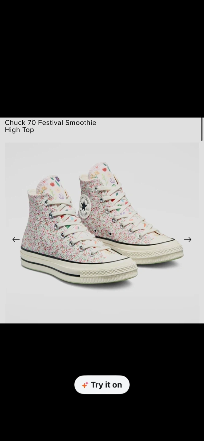 These Converse Chuck 70 sneakers feature a 'Decade Pink/Egret' colourway with a fun floral print. They're high-top style with classic Chuck Taylor details. Perfect for adding a playful touch to any outfit!