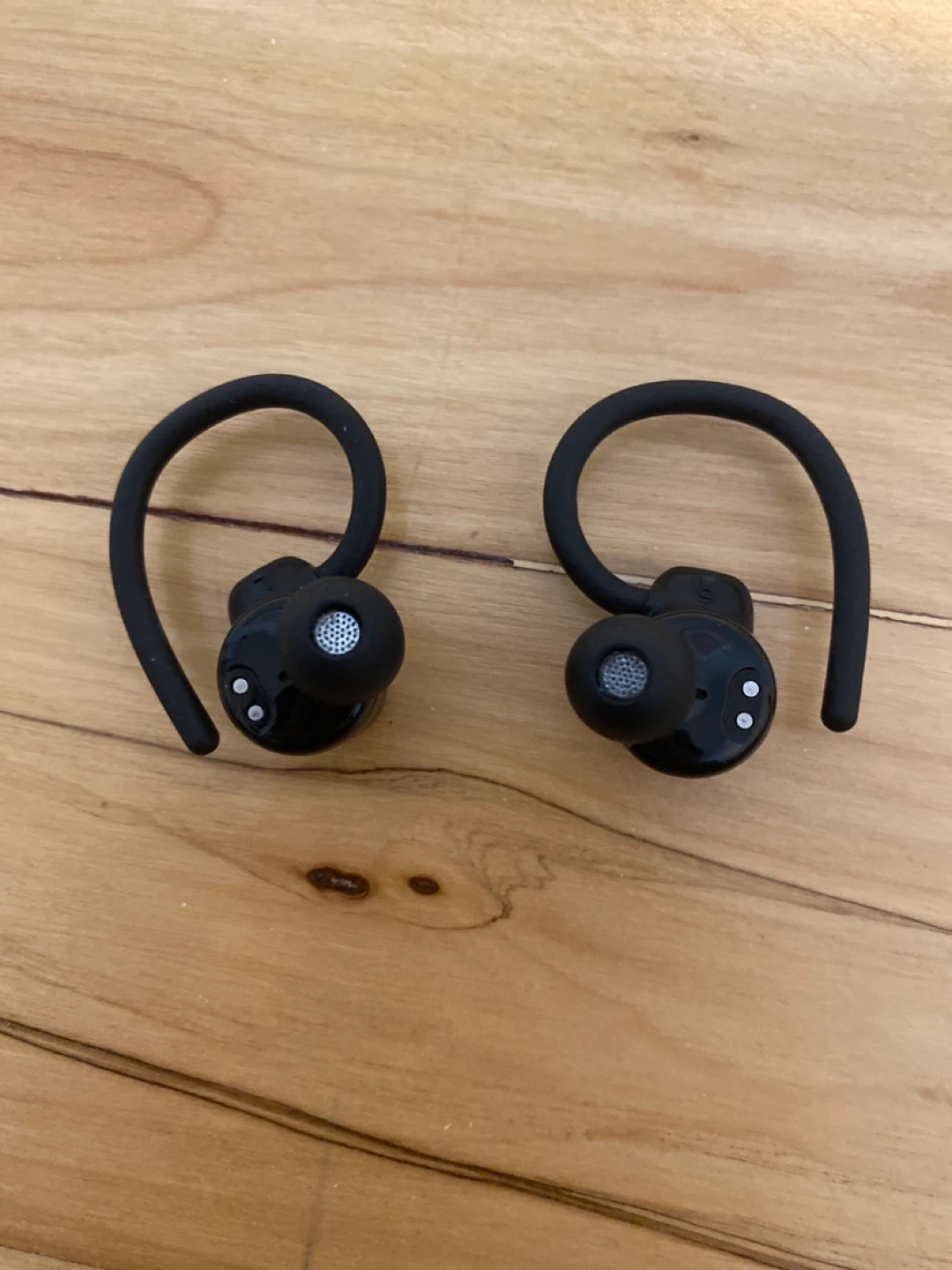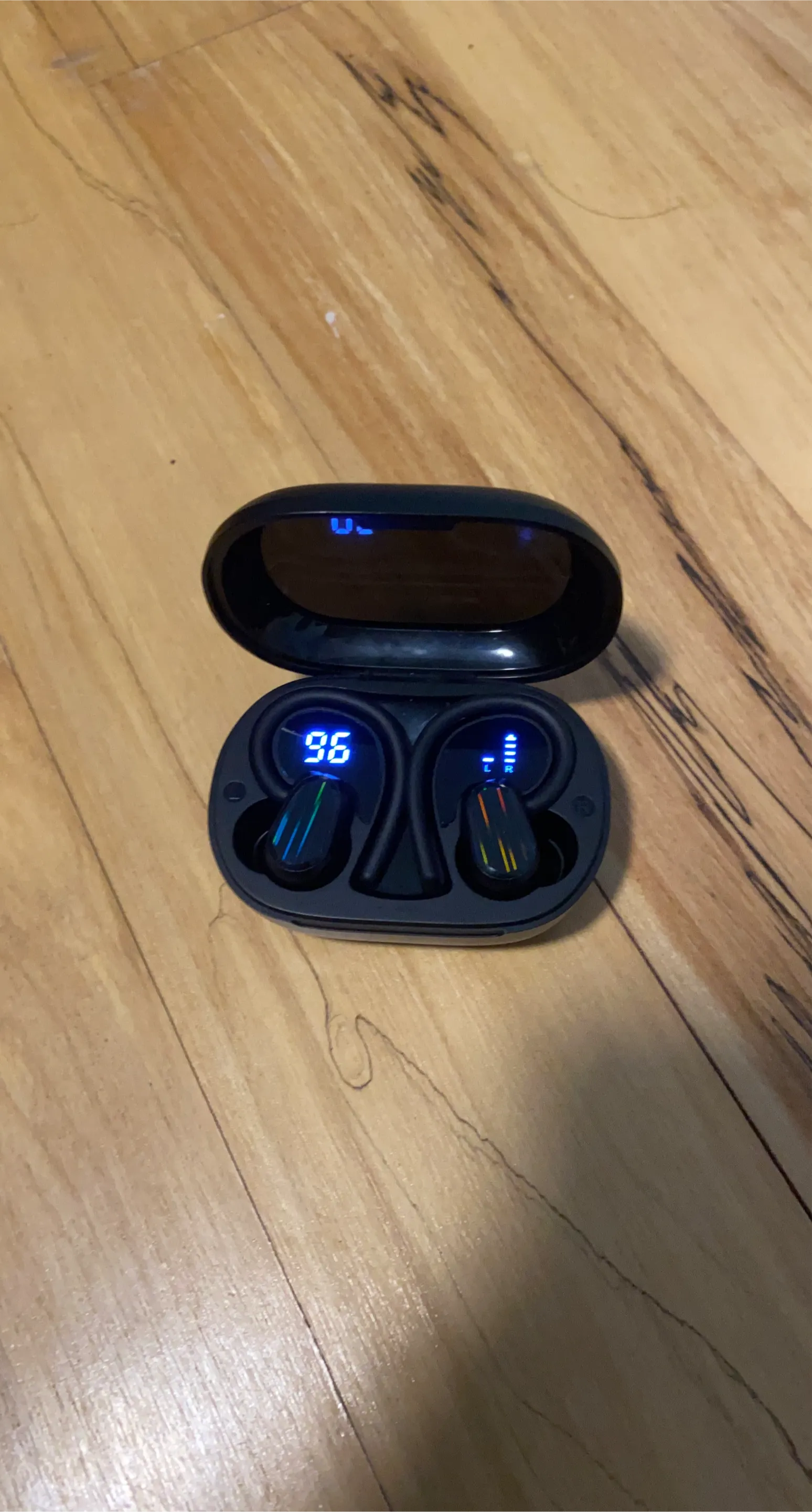 Wireless earbuds in black. They come with a charging case that displays battery percentage. The earbuds feature an over-ear hook design for secure fit. Includes charging cable.