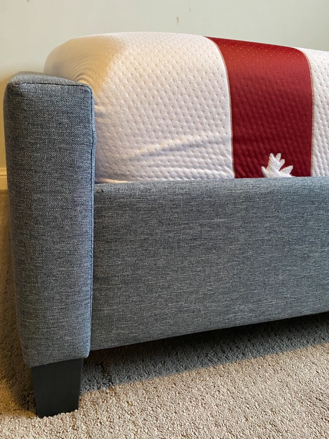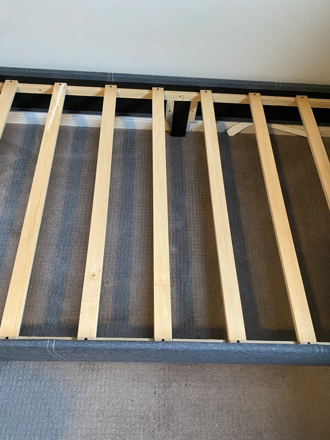 Selling a twin/single bed frame with a grey upholstered finish. Wooded slats with support. It's in great condition and ready for a new home!