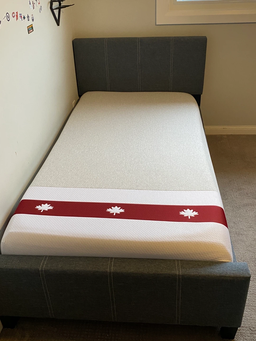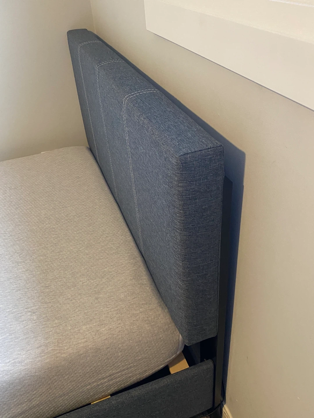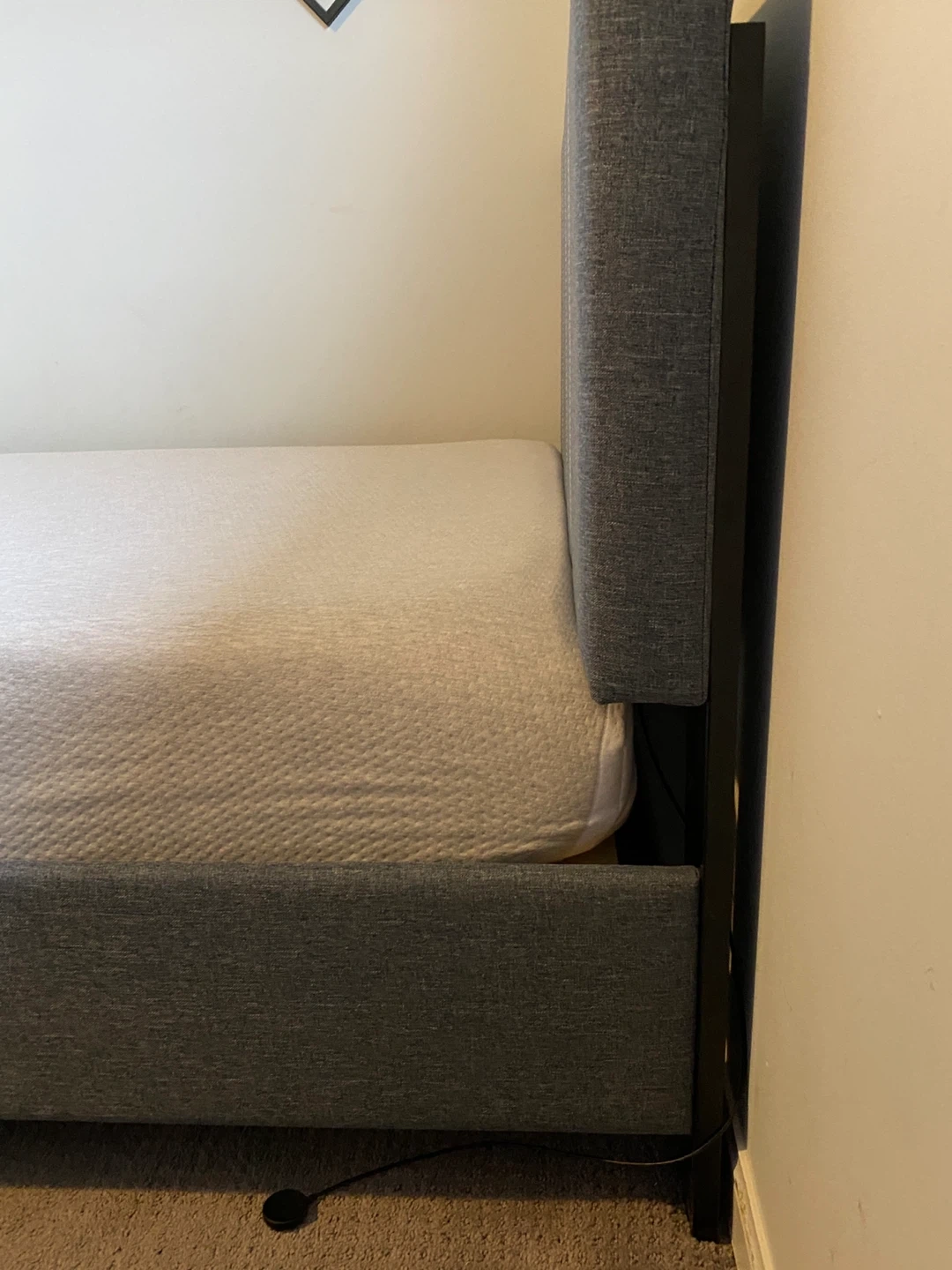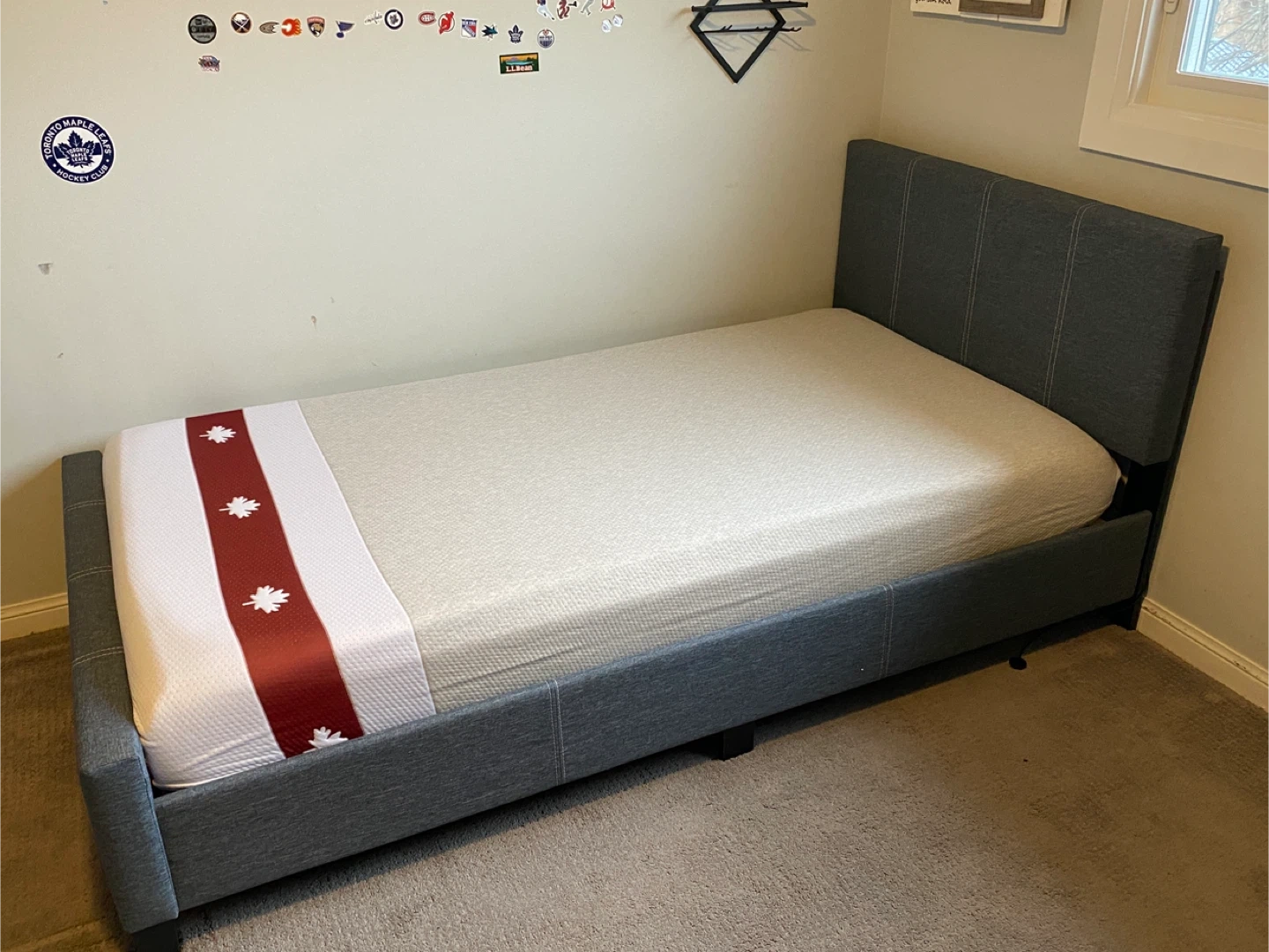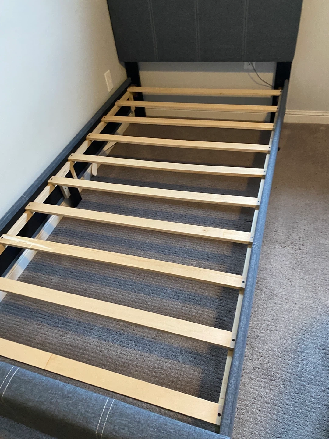 Selling a twin/single bed frame with a grey upholstered finish. Wooded slats with support. It's in great condition and ready for a new home!