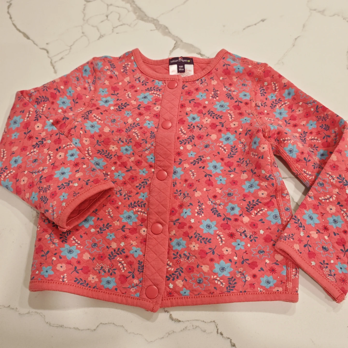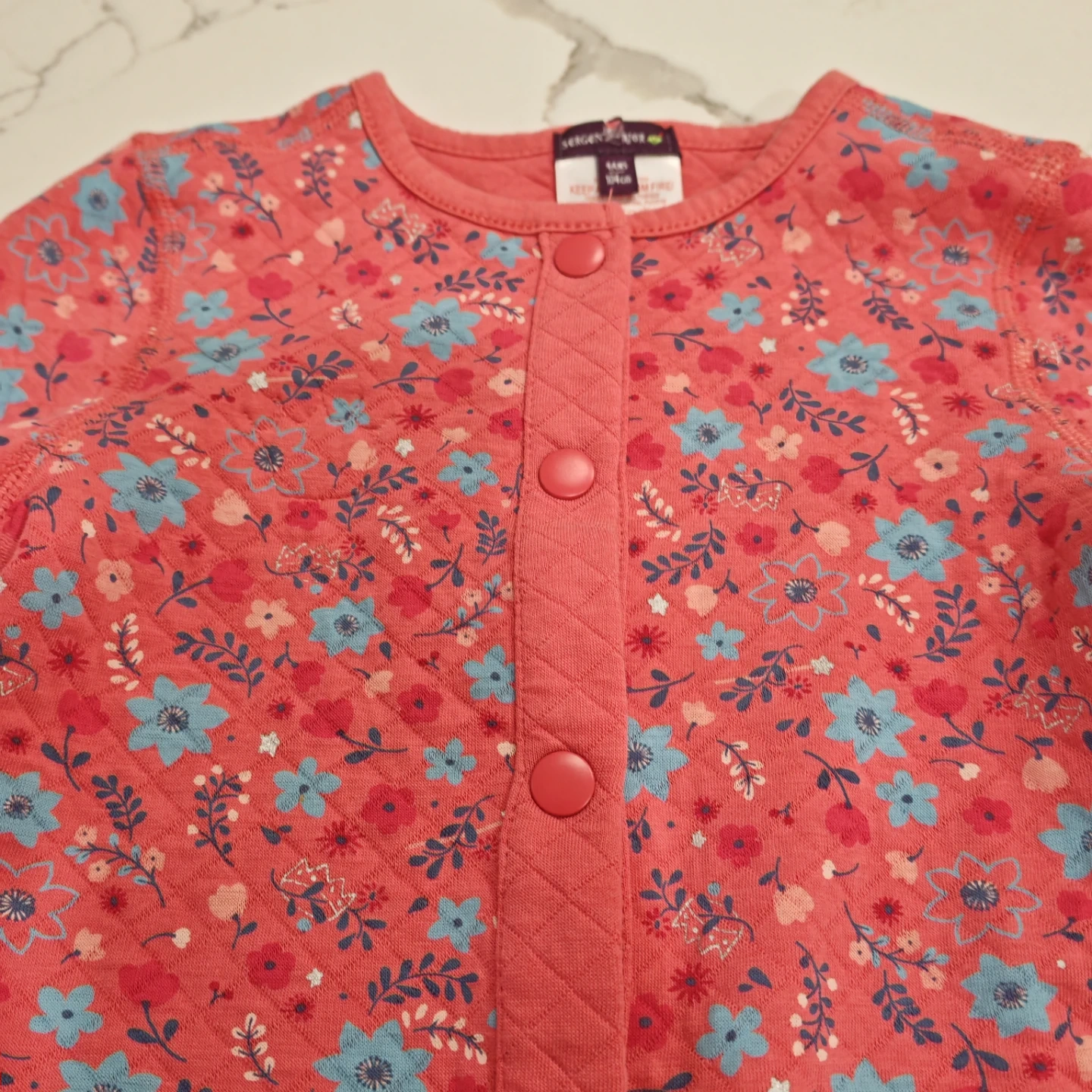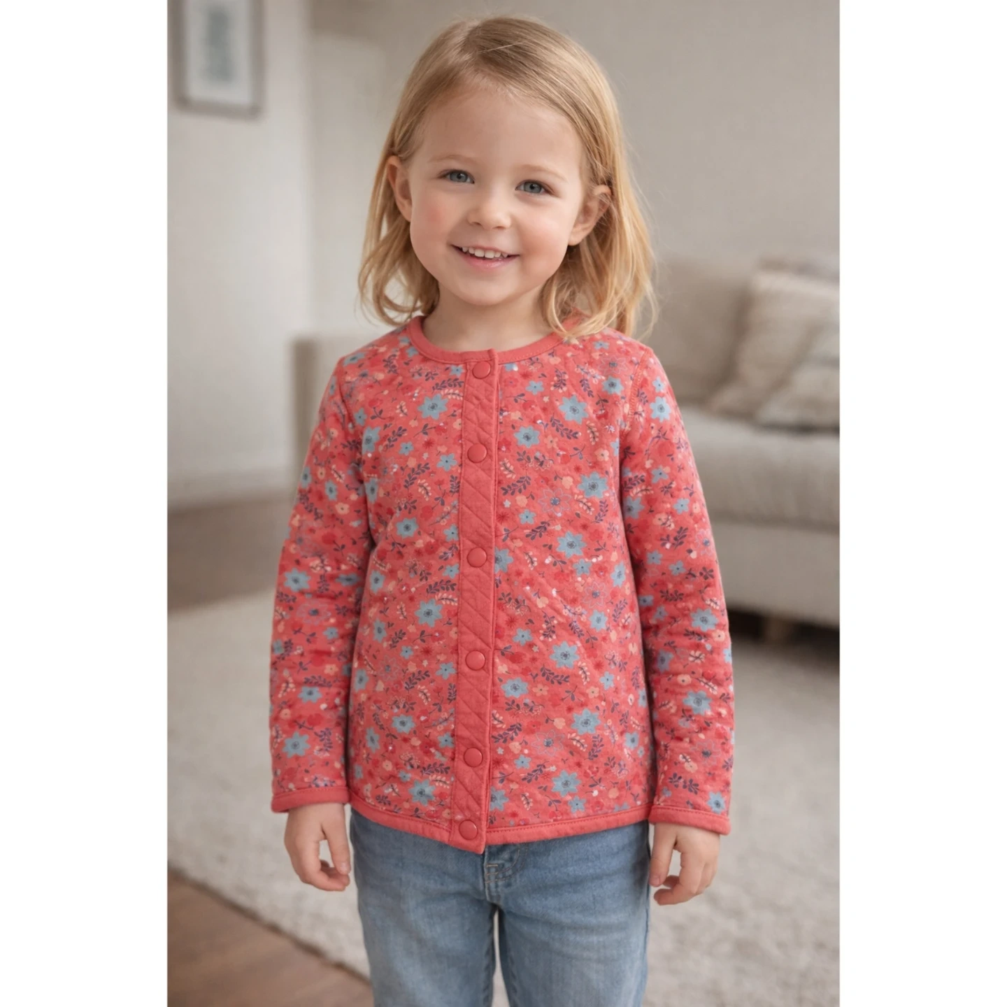This adorable Sergent Major cardigan is perfect for your little one! It features a lovely floral pattern on a quilted coral-coloured fabric.