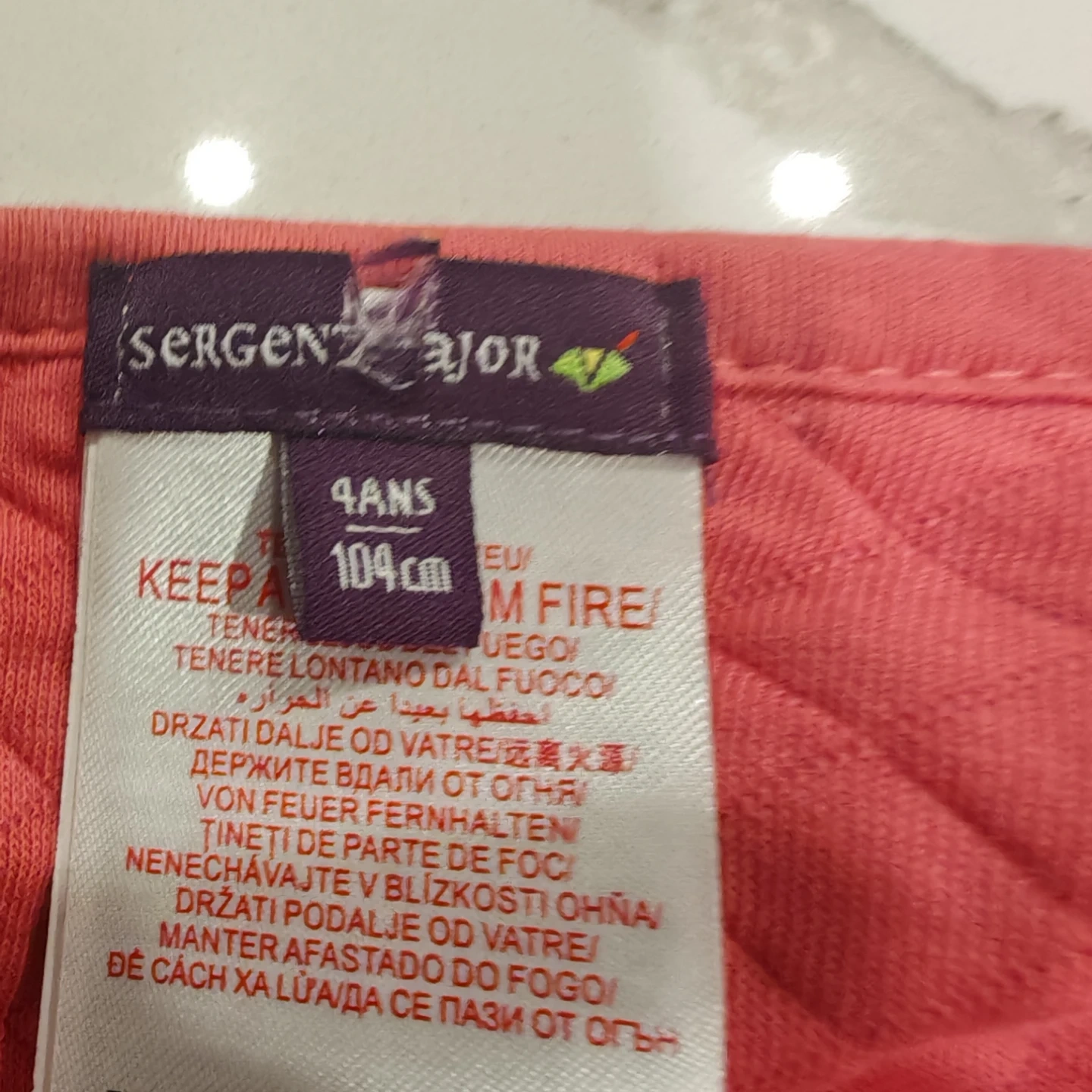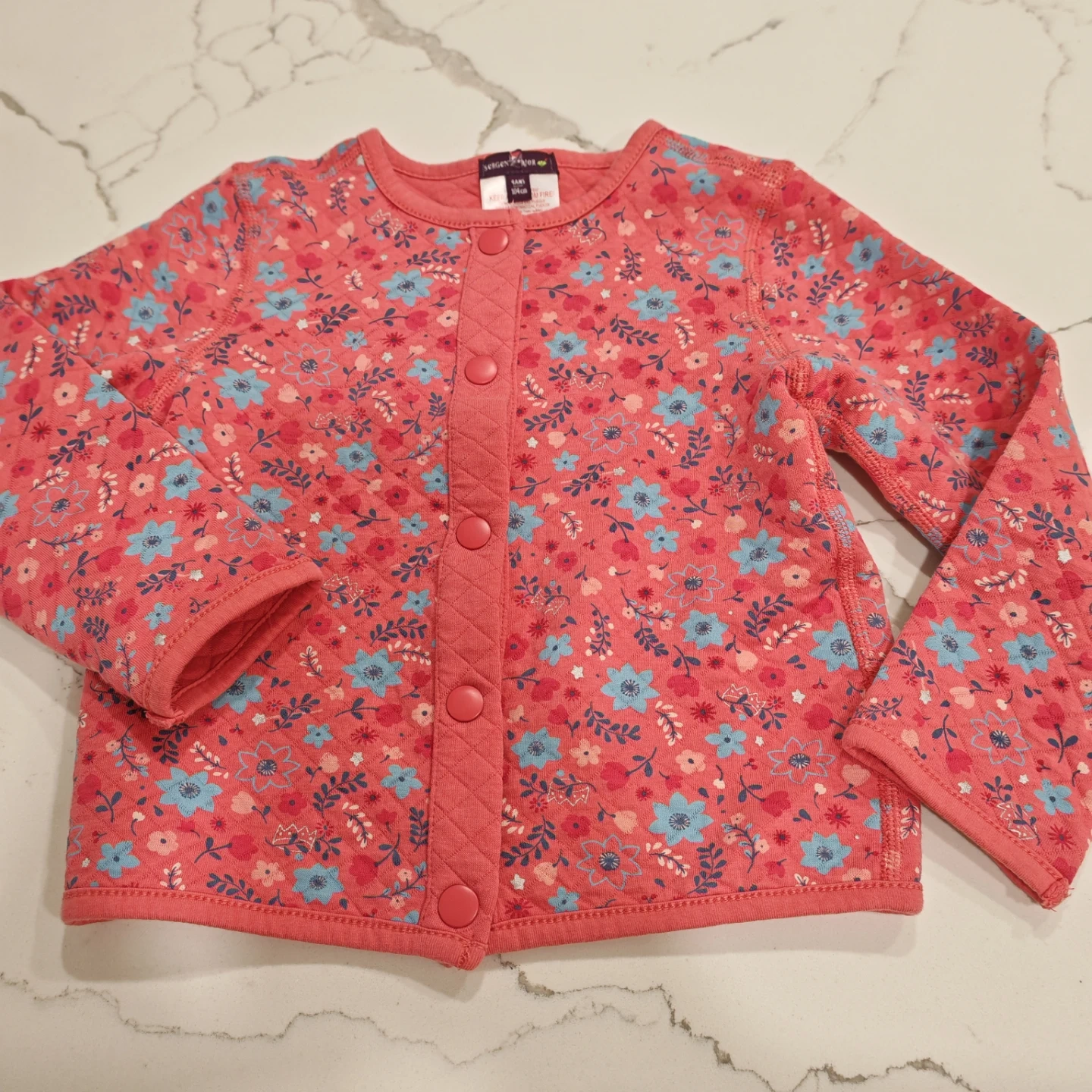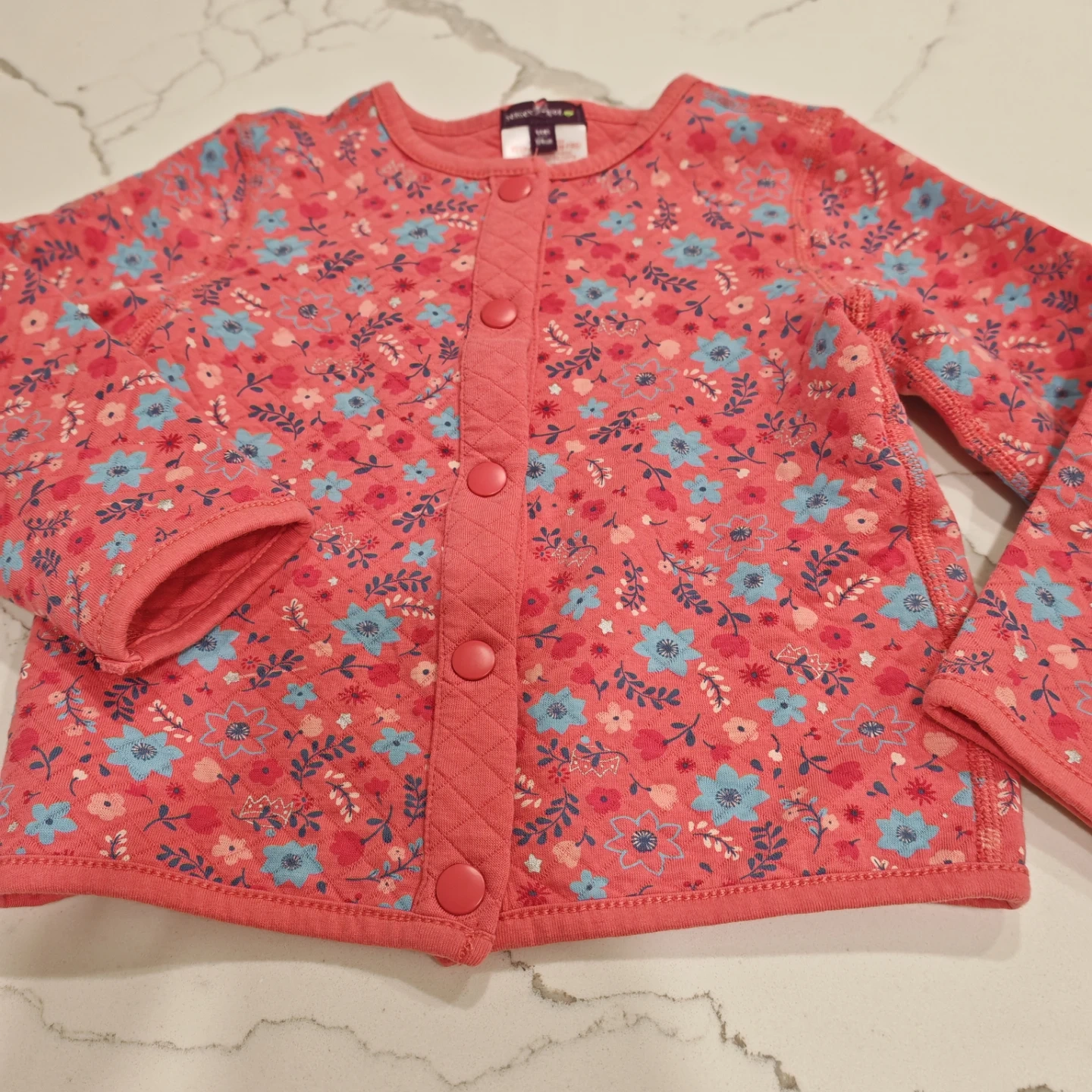 This adorable Sergent Major cardigan is perfect for your little one! It features a lovely floral pattern on a quilted coral-coloured fabric.
