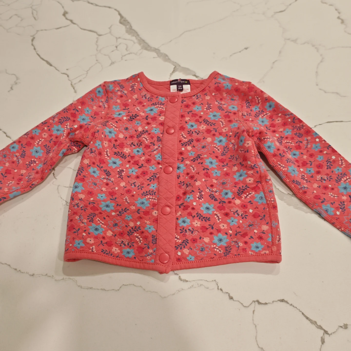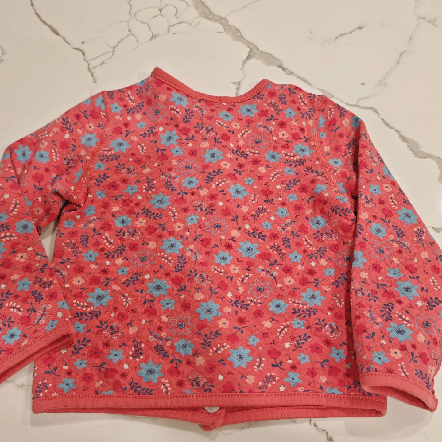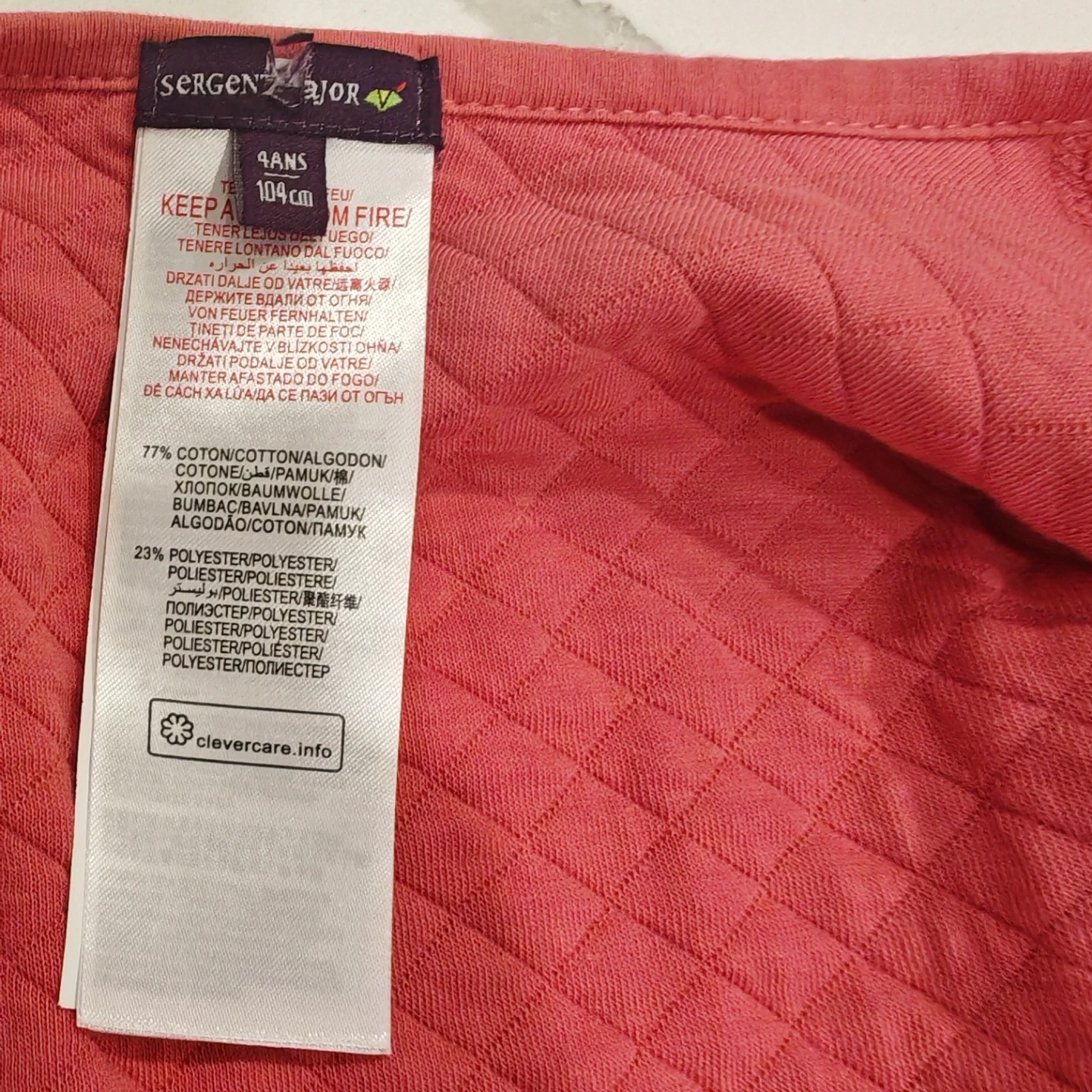 This adorable Sergent Major cardigan is perfect for your little one! It features a lovely floral pattern on a quilted coral-coloured fabric.