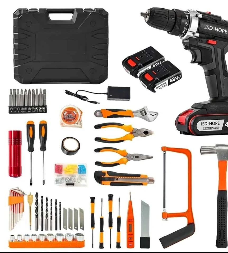 Awesome cordless drill and tool kit. Has everything you need for home projects or repairs. Includes a cordless drill, two batteries, and a charger. Comes with a hard case for easy storage. Also has a hammer, saw, multiple pliers, adjustable wrench, utility knife, various screwdrivers, hex keys, tape measure, flashlight, drill bits, screwdriver bits, and a socket set. Super complete kit!
