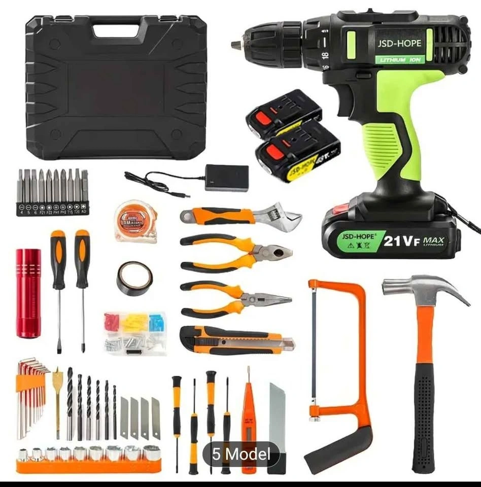 Awesome cordless drill and tool kit. Has everything you need for home projects or repairs. Includes a cordless drill, two batteries, and a charger. Comes with a hard case for easy storage. Also has a hammer, saw, multiple pliers, adjustable wrench, utility knife, various screwdrivers, hex keys, tape measure, flashlight, drill bits, screwdriver bits, and a socket set. Super complete kit!