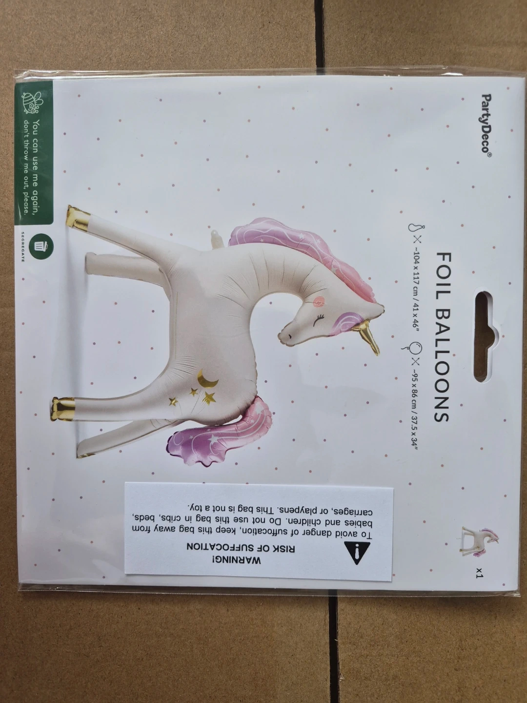 This is a PartyDeco foil balloon in the shape of a unicorn. It measures approximately 104 x 117 cm or 41 x 46 inches when inflated. It's a fun decoration for parties!