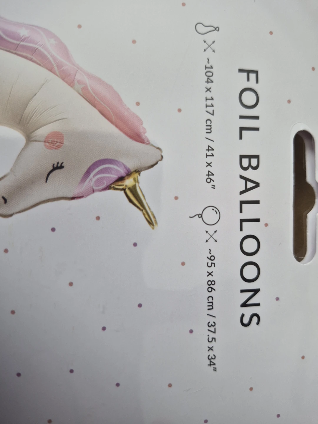 This is a PartyDeco foil balloon in the shape of a unicorn. It measures approximately 104 x 117 cm or 41 x 46 inches when inflated. It's a fun decoration for parties!