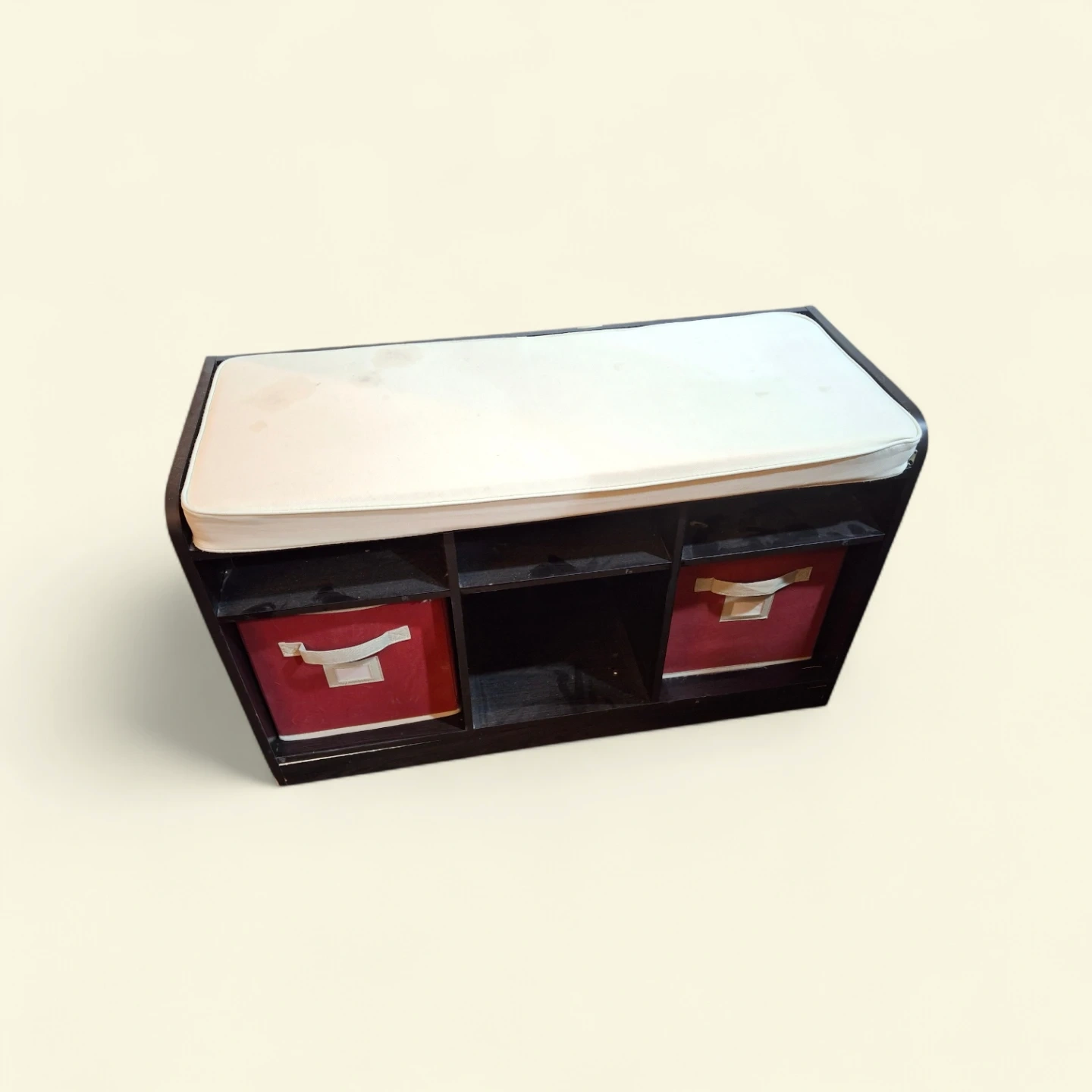 This dark brown storage bench comes with two red fabric bins. It offers seating and handy storage. Bin material is fabric.