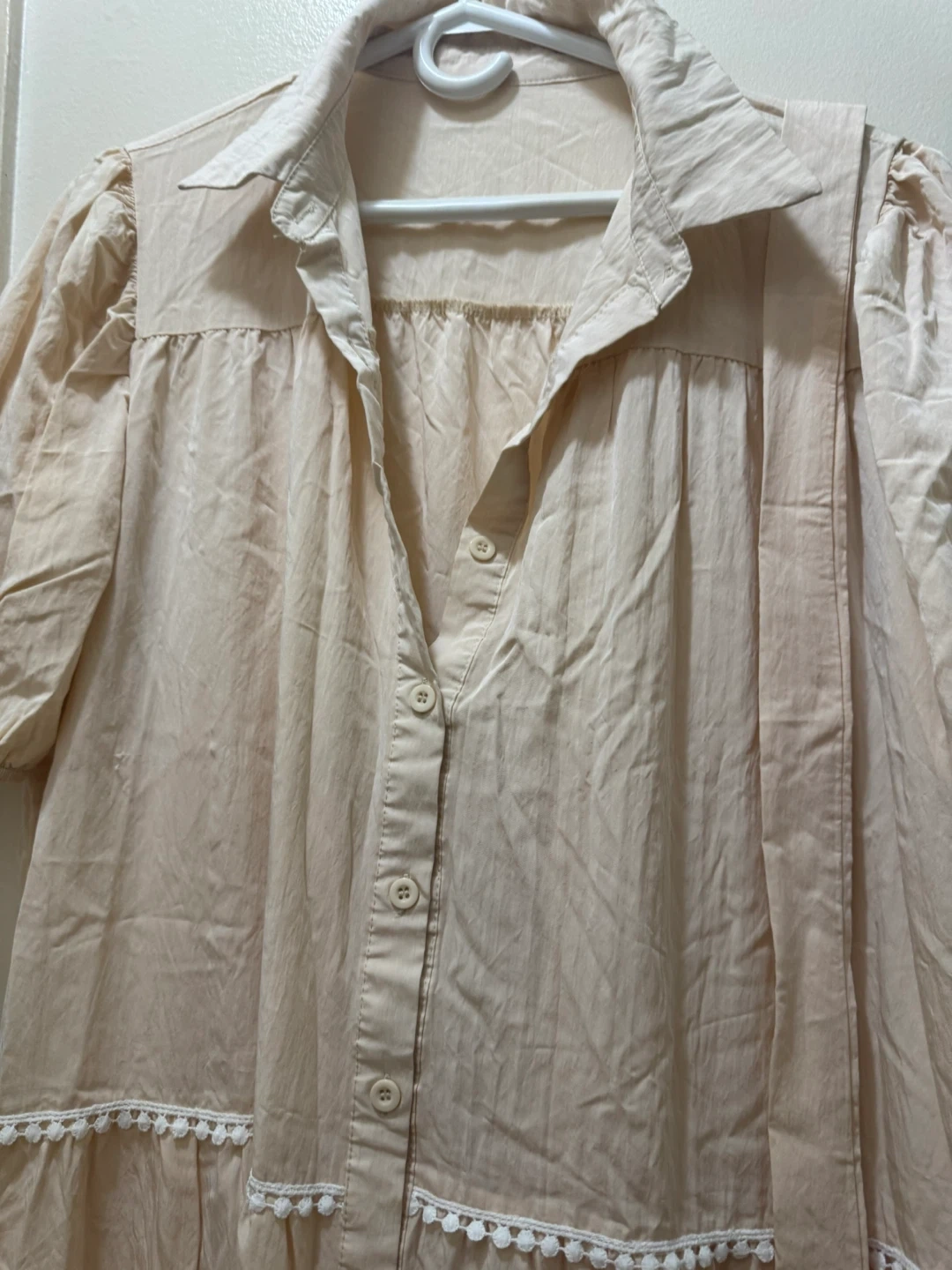 A lovely off white tiered dress! It features a button-down front and delicate white trim. Perfect for a casual day out or a summer evening. In great condition!
