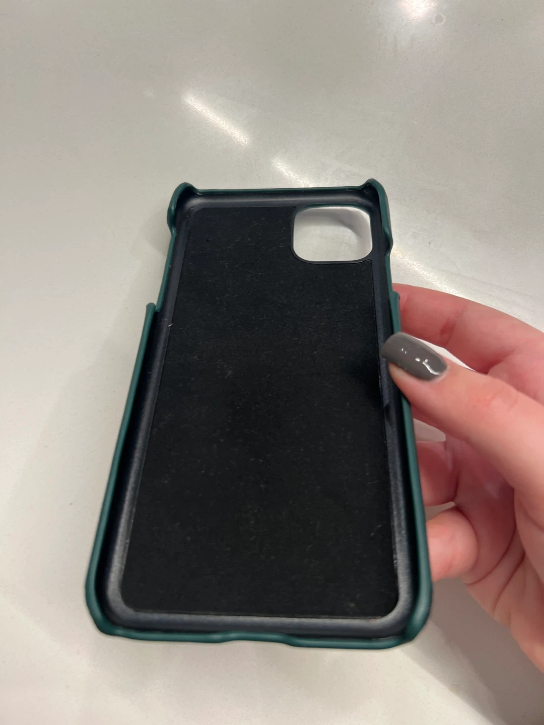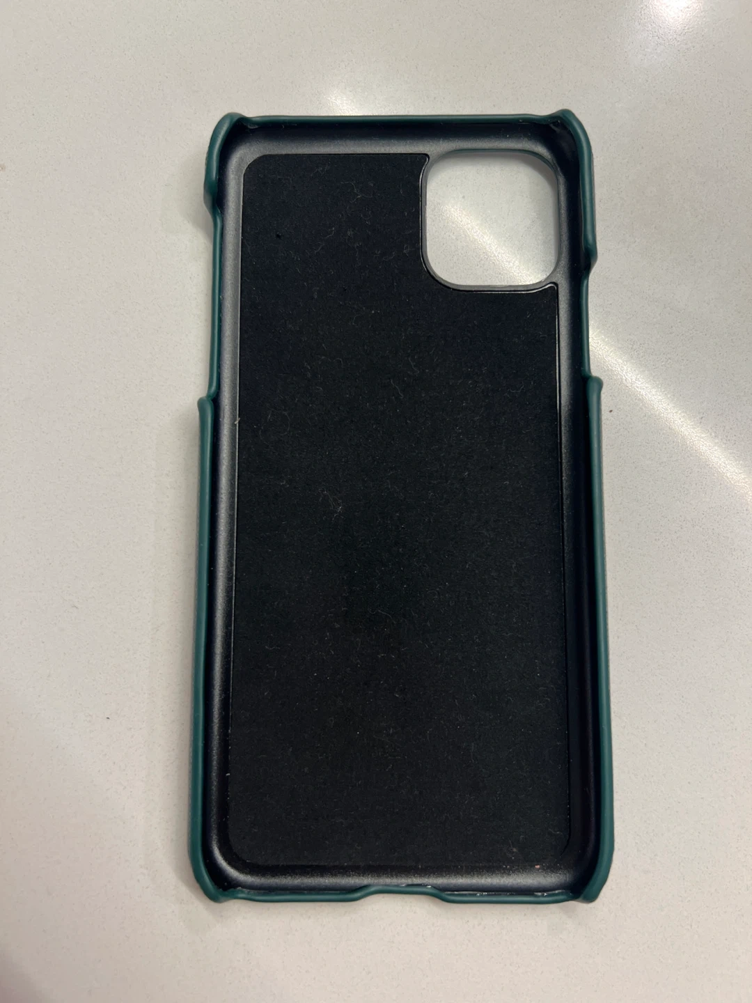 This Roxan phone case is designed for iPhone 12 and 12 Pro. It's made from green vegan leather with a textured finish. The interior is lined with soft microfiber.