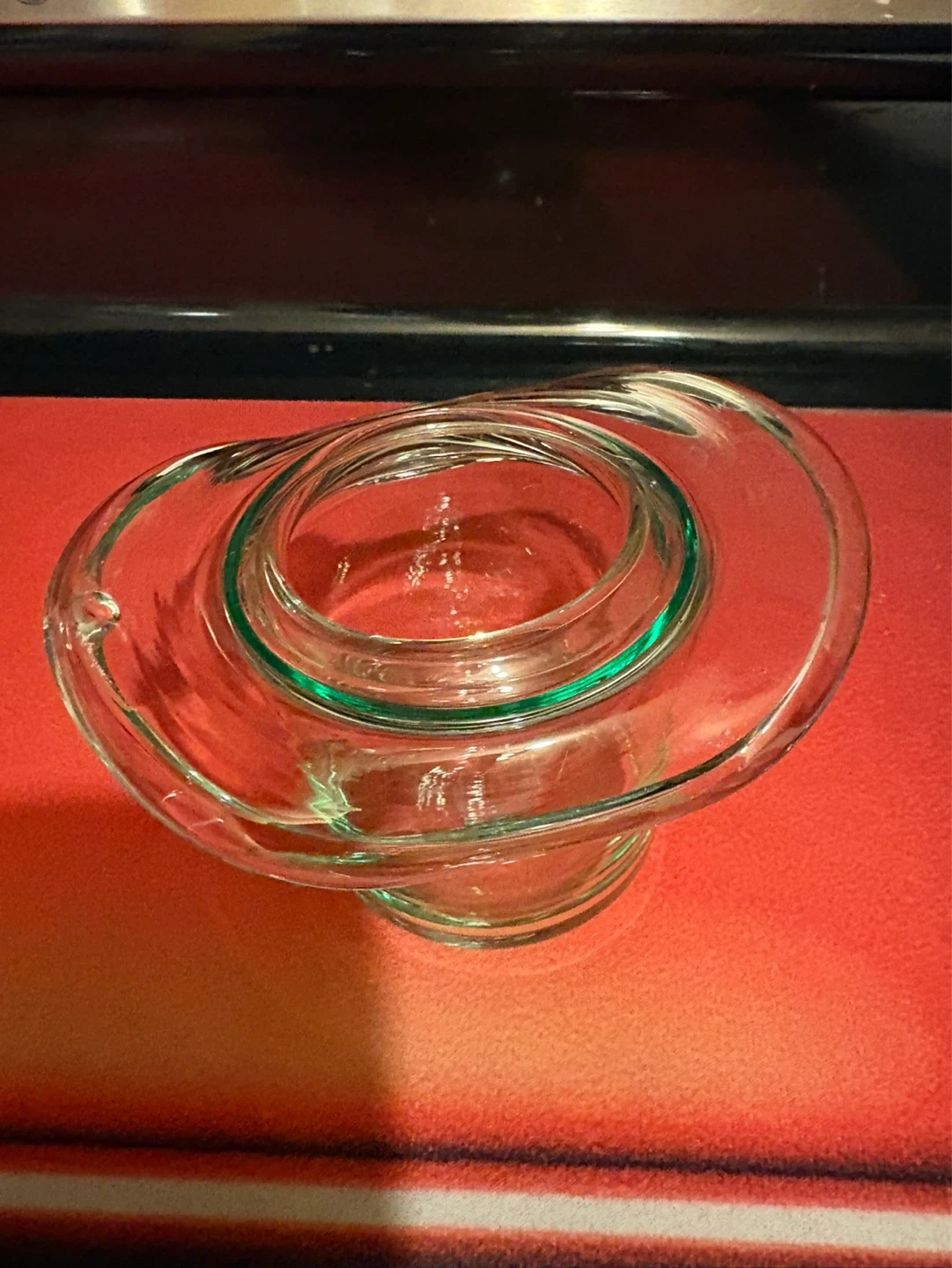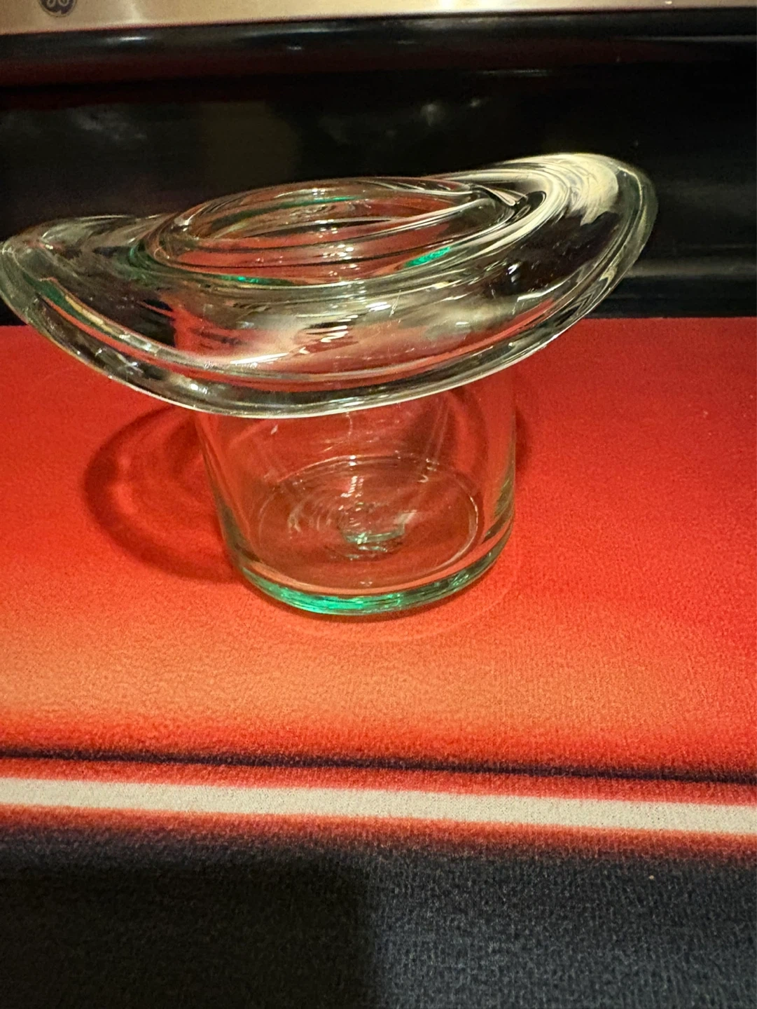Glass votive candle holder with a unique wide-brimmed design. Clear glass . It's perfect for adding a decorative touch to any room.