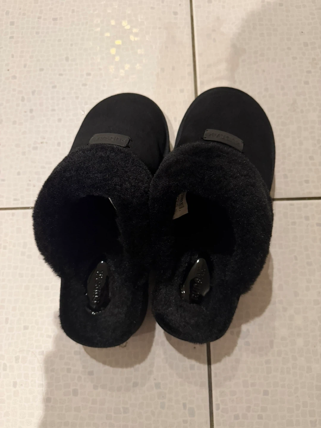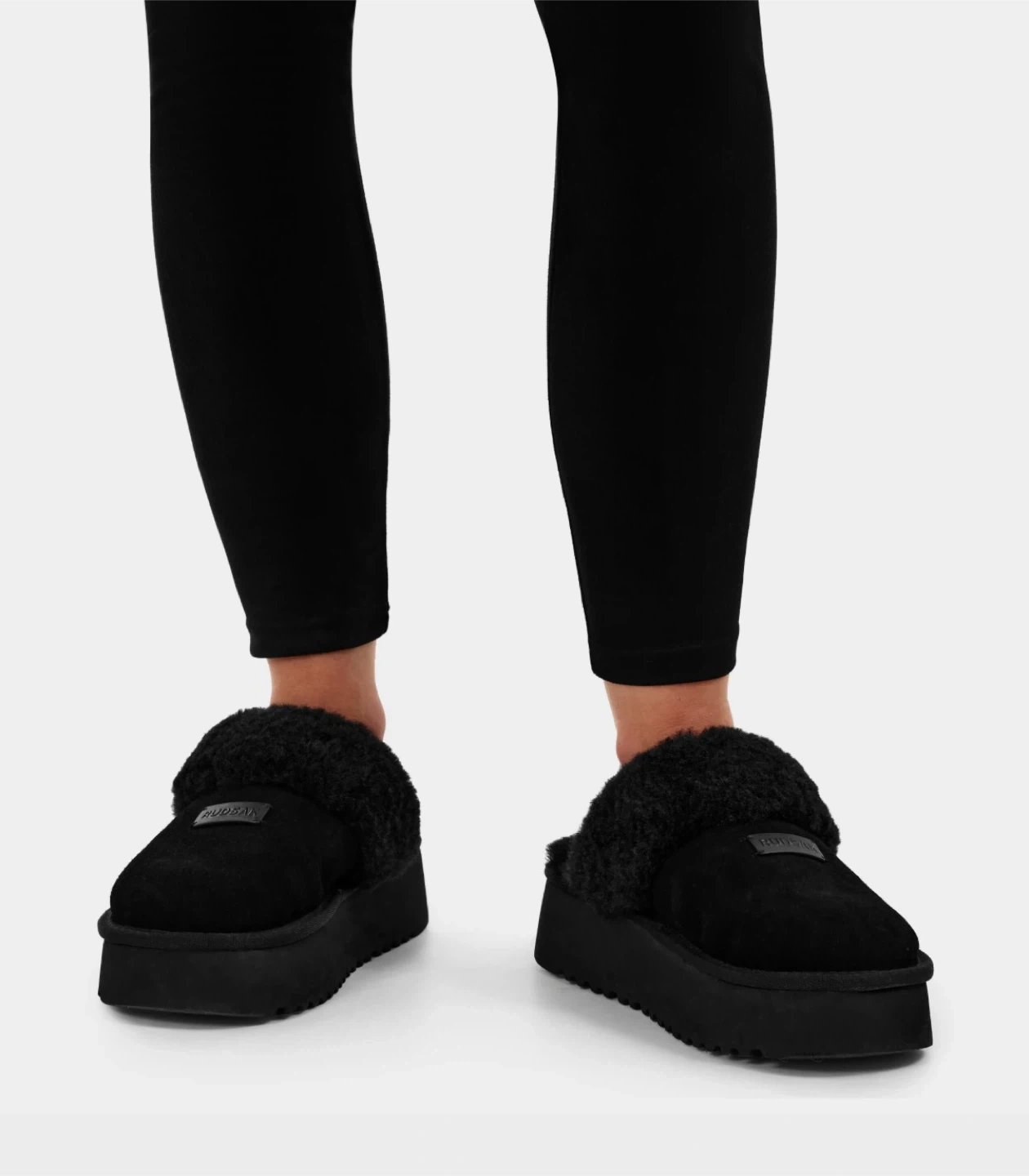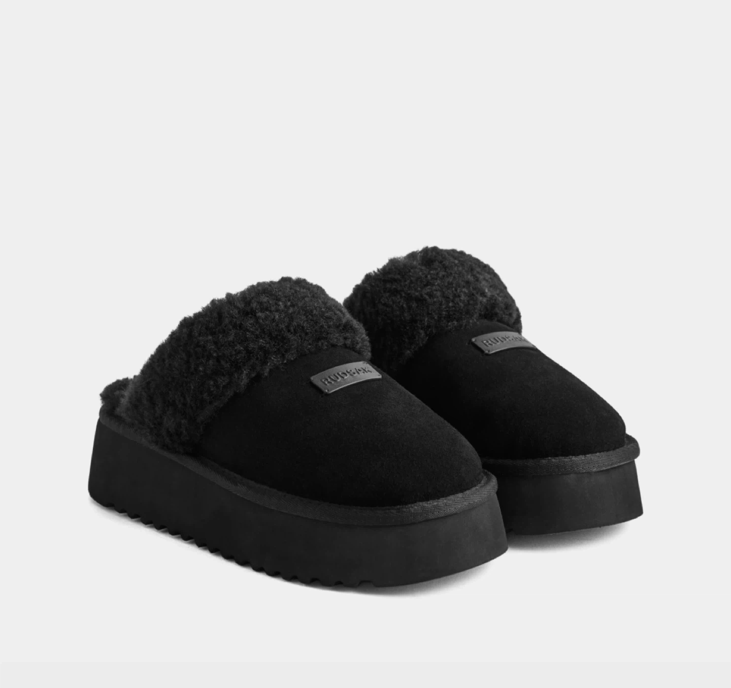 Cozy Rudsak slippers with a black suede exterior and warm sheepskin lining. They feature a supportive platform sole. Perfect for lounging around the house!