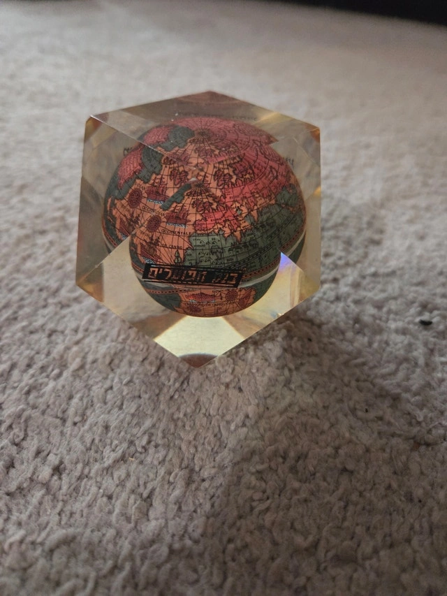 A rare vintage executive paperweight from Bank Hapoalim (Israel). This 3.5-inch piece features a detailed, antique-style globe suspended in high-clarity lucite with polished faceted edges. Key Details: Size: Large 3.5" cube. Front Inscription: Features the black Bank Hapoalim logo (בנק הפועלים). Back Inscription: Includes the commemorative slogan "מעבר להון האנושי" (Beyond Human Capital). Design: Internal globe depicts a vintage world map. Condition: Excellent vintage condition with clear, non-yellowed acrylic. Origin: A genuine piece of Israeli banking history from the late 20th century. A perfect statement piece for a home office, library, or for collectors of Judaica and financial memorabilia.