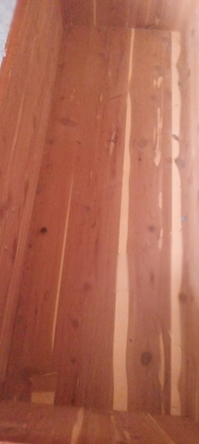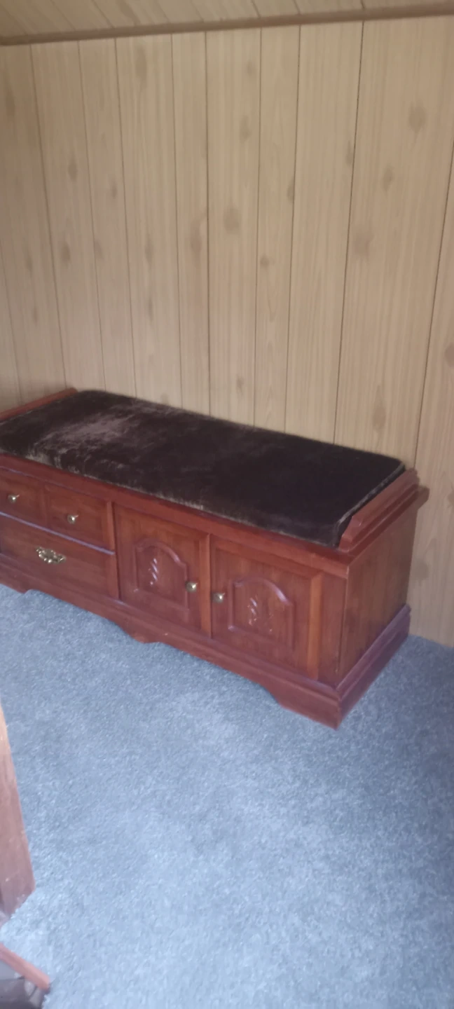 This wooden hope chest features a plush, dark brown upholstered seat, offering comfortable seating and cedar lined inside,lots of storage room good for putting at the end of your bed for blankets