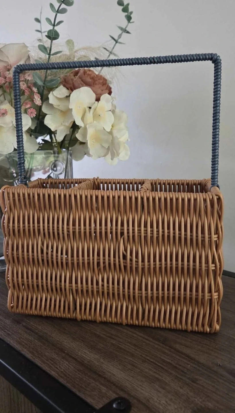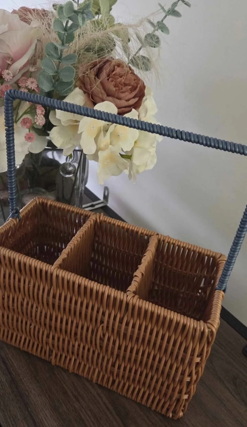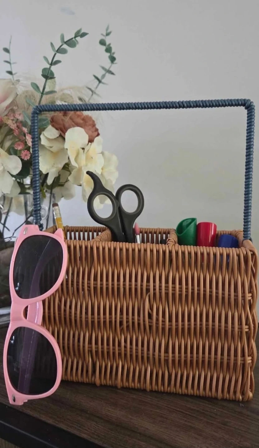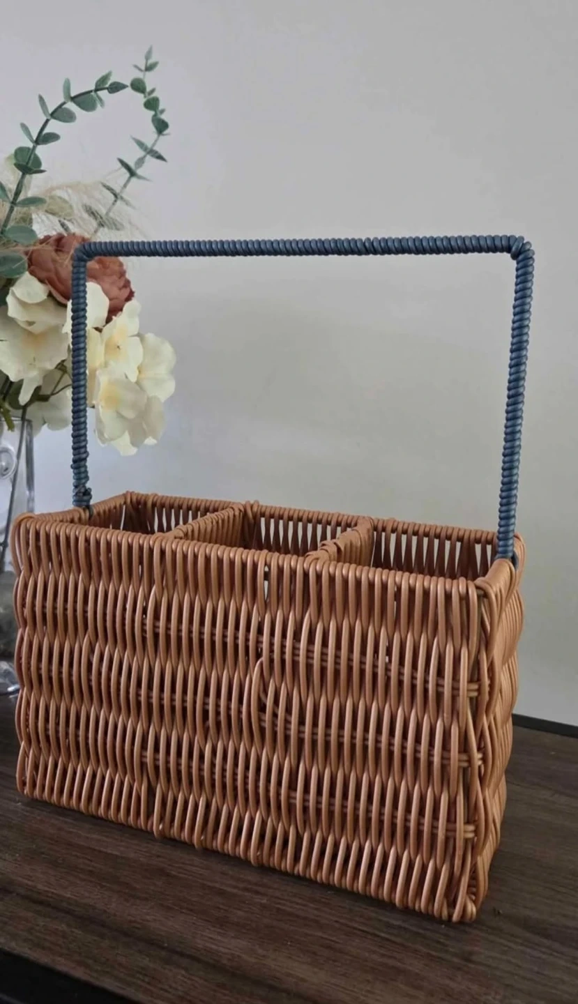 A woven wicker caddy with a blue rope-wrapped handle. It features three compartments inside, perfect for organizing craft supplies or desk items. This caddy is great for keeping small tools and accessories tidy!
