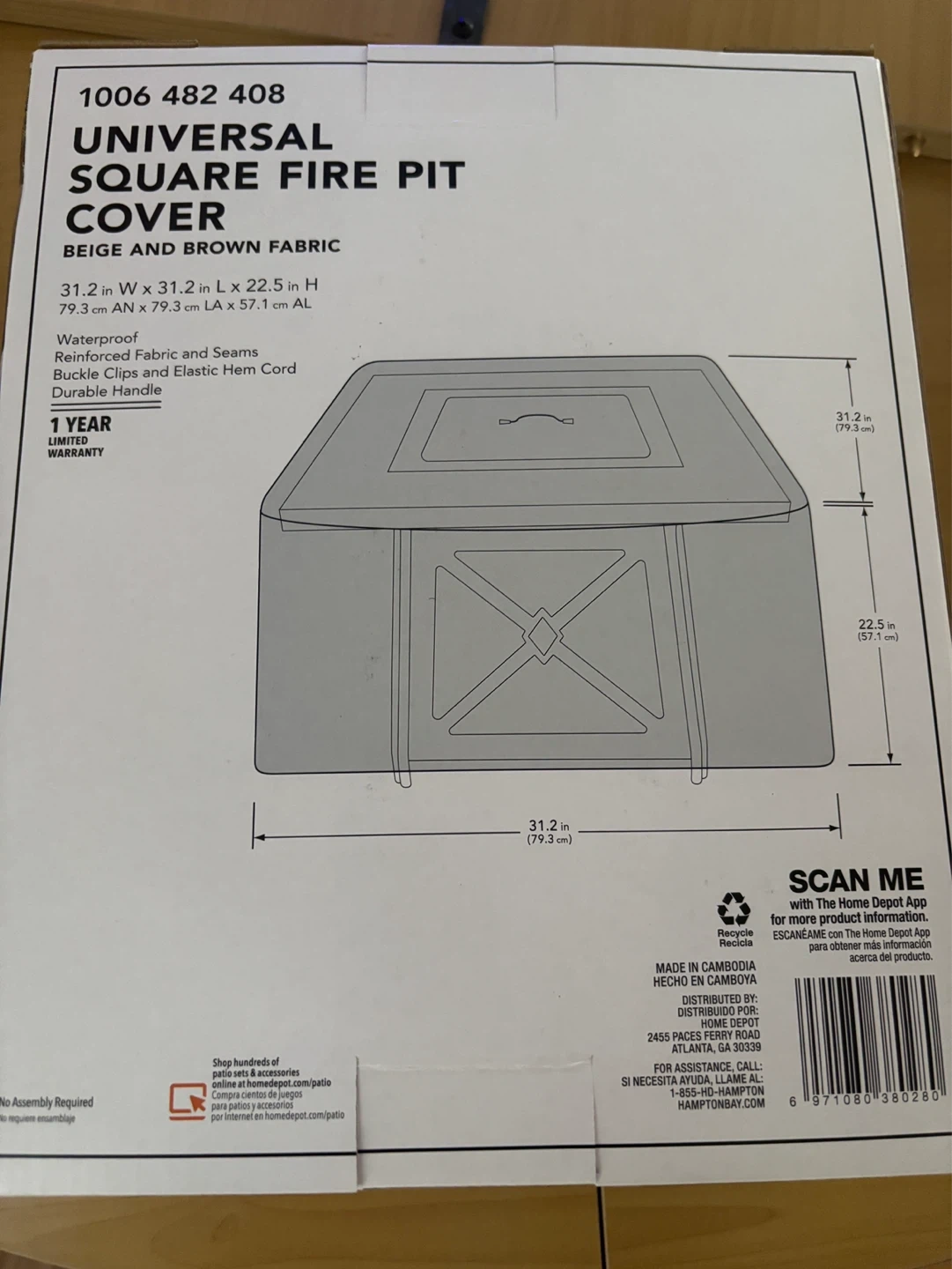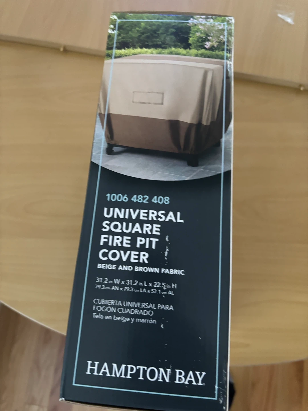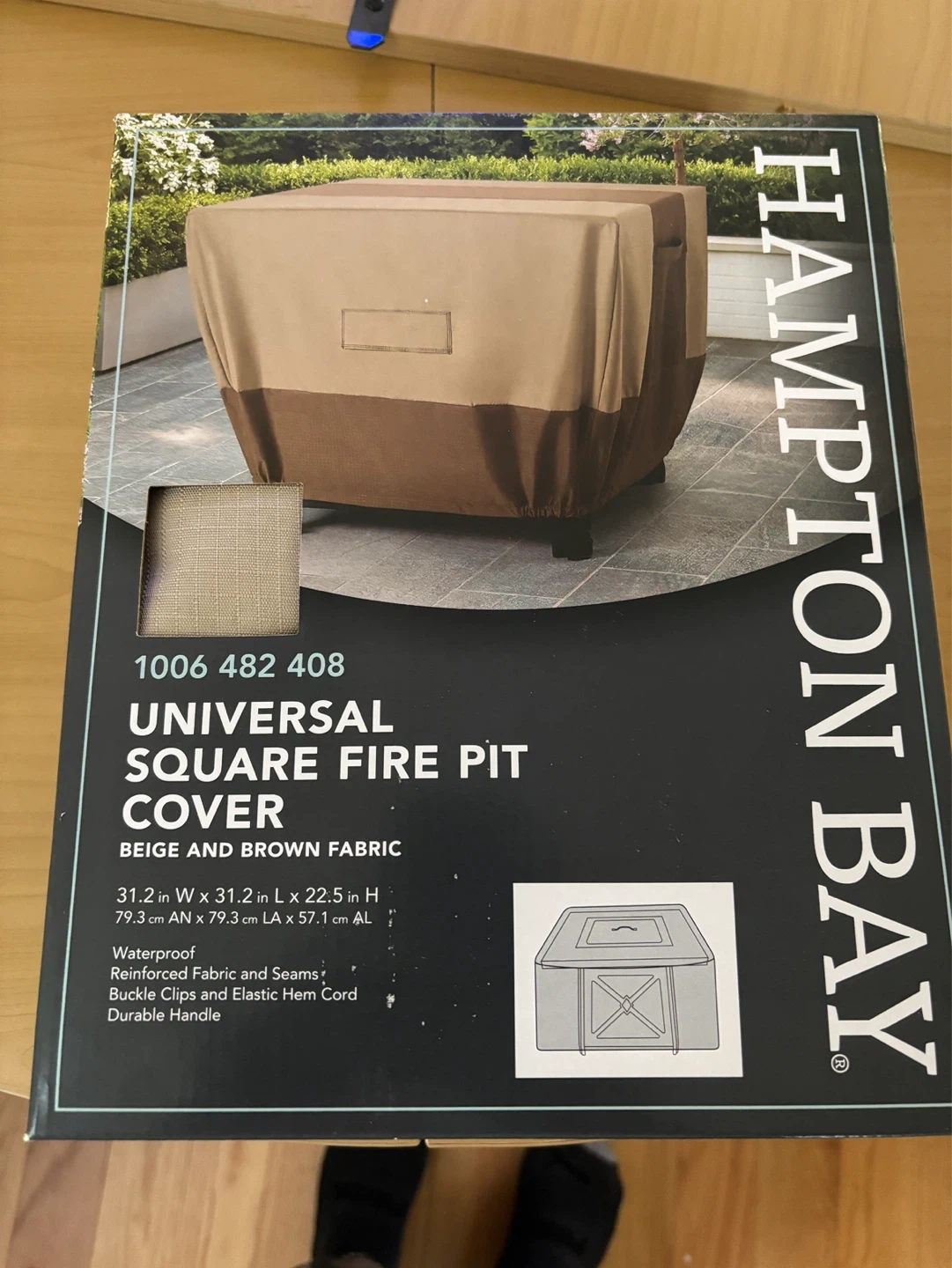 This is a Hampton Bay universal square fire pit cover. It's made from waterproof, reinforced fabric and seams. Features buckle clips and elastic hem cord for a secure fit. Includes a durable handle for easy removal.
