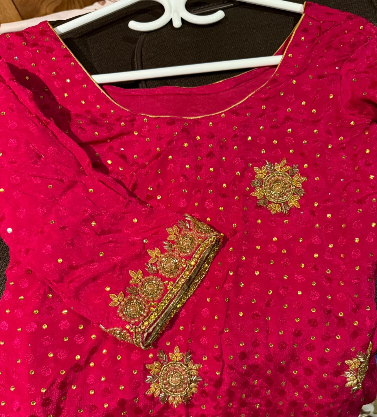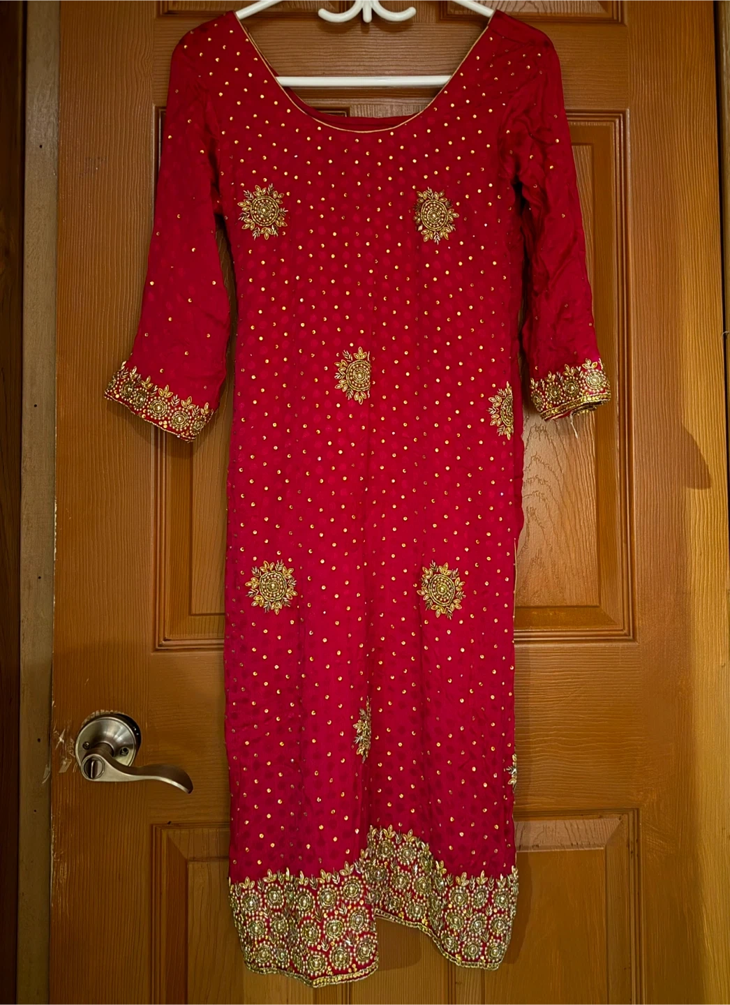 Beautiful Magenta/ Dark Pink salwar kameez with gold embroidery, heavy Dupatta ! This traditional outfit is perfect for special occasions or celebrations. The intricate detailing adds a touch of elegance and charm.