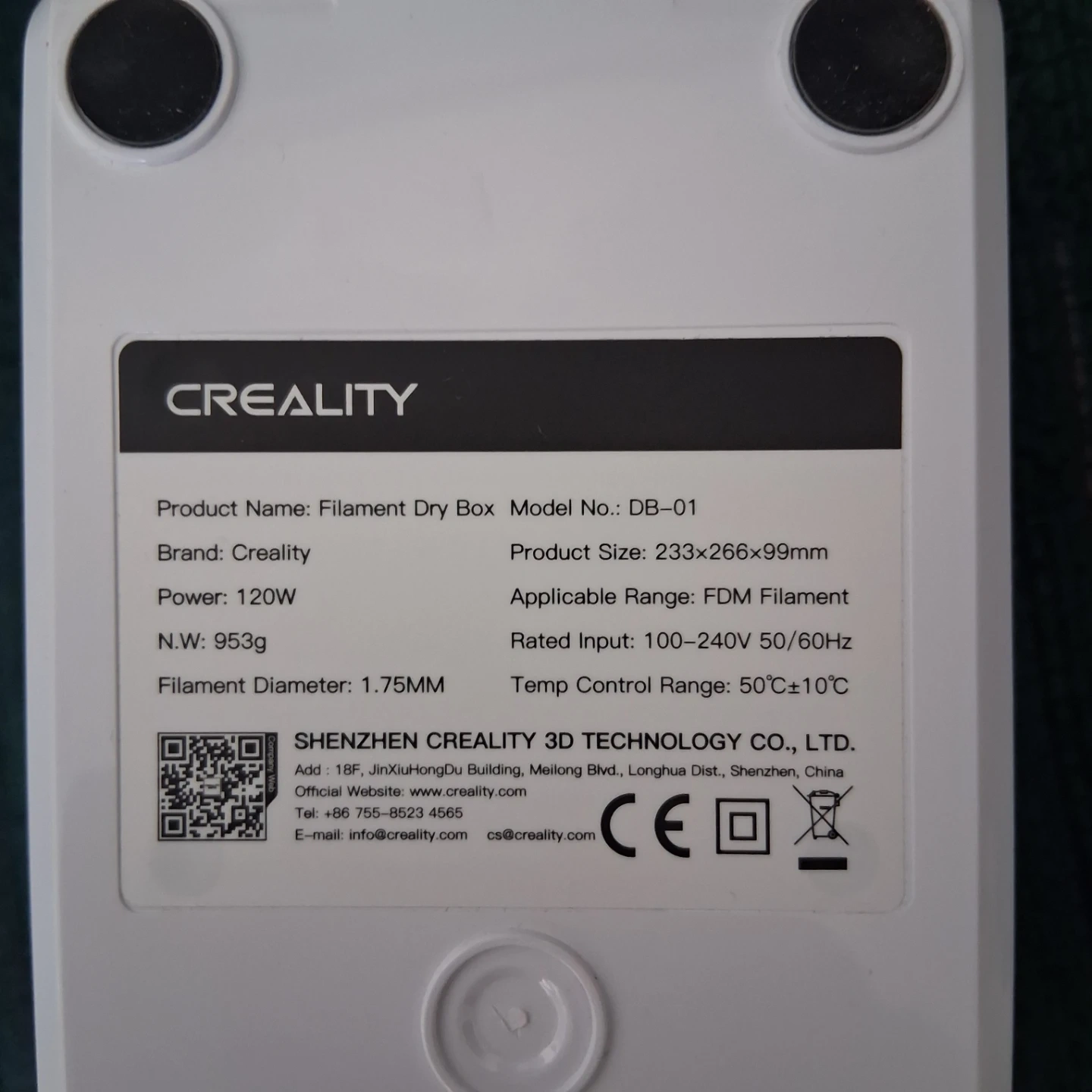 Single roll Creality Filament Dry Box, model DB-01. It's white and designed for FDM filament. Power is 120W, and it operates within a 100-240V input