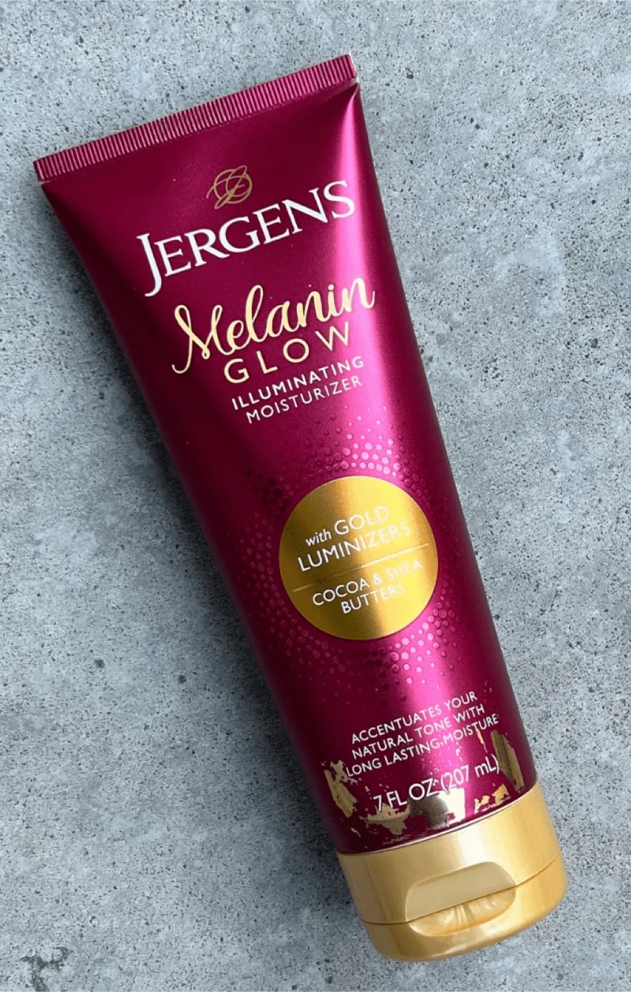 Jergens Melanin Glow Illuminating Moisturizer. It's formulated with gold luminizers, cocoa, and shea butters. This moisturizer accentuates your natural tone with long-lasting moisture. 7 fl oz (207 mL).
