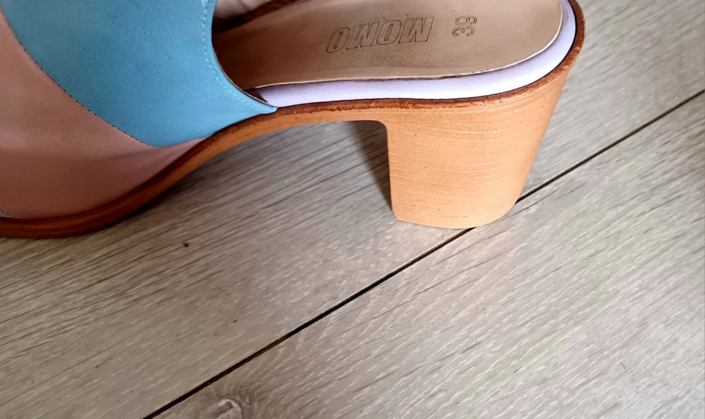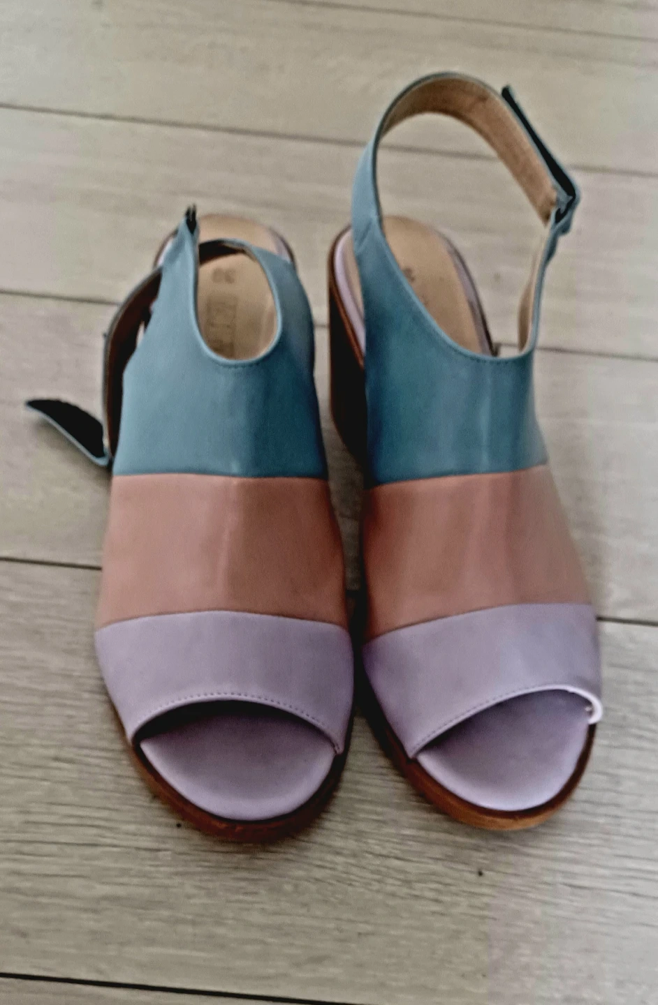 Colour block sandals from MOMO with a chunky block heel. Features an ankle strap with buckle closure. These are size 39 or 8