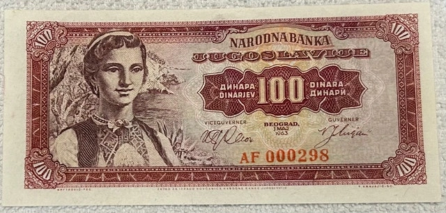 This is a 1963 Yugoslavia 100 Dinara banknote in circulated condition. The front features a woman and the back has a coastal scene. It's a neat piece of history to add to your collection! I'm clearing out my collection. Feel free to message if you have any questions!