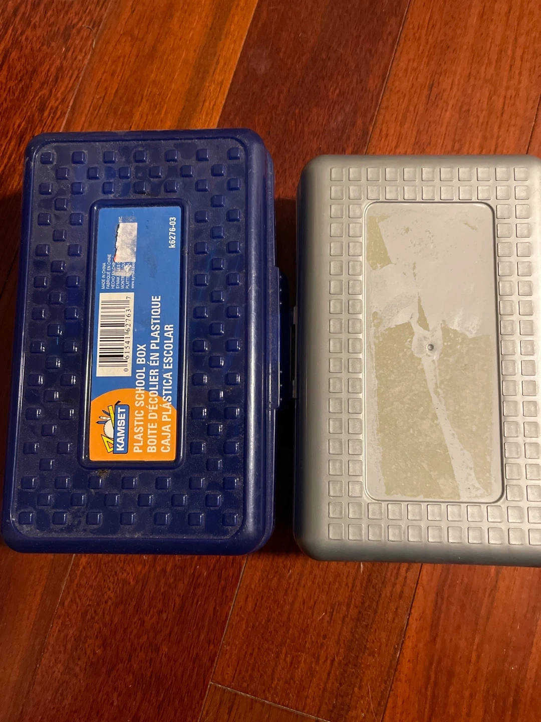 This is a Kamset plastic school box. It's great for keeping your pencils and small supplies organized. The durable plastic design makes it easy to carry.