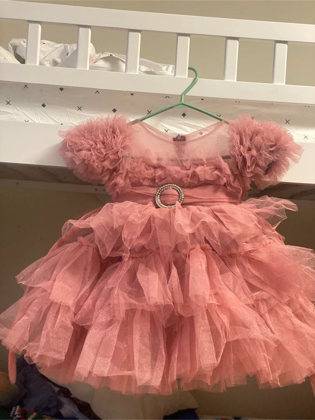 This sweet pink tulle dress features adorable ruffled sleeves and a sparkly rhinestone belt. It's perfect for parties or special occasions!