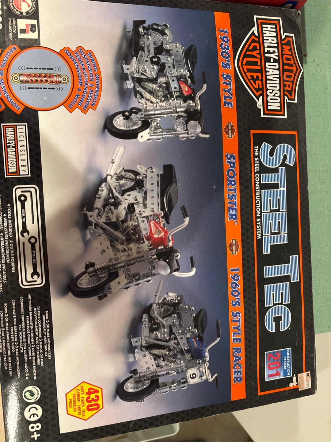 Harley-Davidson Steel Tec construction system featuring a 1930's style Sportster motorcycle model. The box includes 430 elements. It was originally priced at $59.92.New.