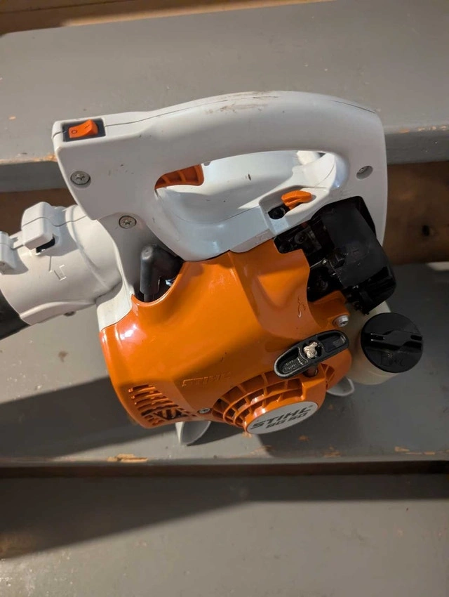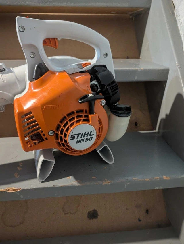 Used for 3 seasons. Has been run seldomly. In good condition STIHL BG50 27.2cc Gasoline-Powered Handheld Blower. It is built here in America. This reasonably priced tool boasts the highest power-to-weight ratio in the STIHL gas-powered line making it the perfect choice for homeowners seeking premium STIHL quality. Its light-weight, compact design features a fuel-efficient engine, tool-less air filter access and an upright fuel tank for easier filling. Clean up yard waste and leaf piles quickly and easily with this affordable and convenient blower. Features Adjustable Nozzle is great for stairs and operators of different heights. Protected Spark Plug is protected yet easy to change. Throttle Trigger Lockstop Switch for ease of operation. Purge Pump Primer lets you prime the carburetor without flooding it. Air Filter Cover is easy to remove without tools for fast and easy filter cleaning or replacement. Protected Spark Arrestor Muffler has large baffles which reduce sound level and contains a screen designed to reduce the emission of sparks. High-Tech Polymer Housings are lightweight, withstand greater impact and are corrosion-resistant. Helper Handle for added air direction control and vacuum use. Upright Translucent Fuel Tank allows operator to easily check fuel level before starting work. Upright for easy filling.