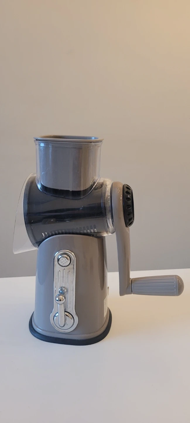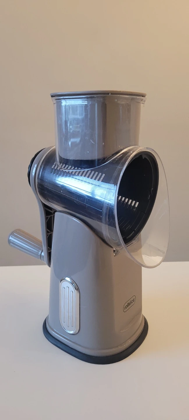 This is a Rollslice rotary grater. It features a grey and clear plastic design with a silver crank handle. Great for quickly shredding or slicing vegetables and cheese!