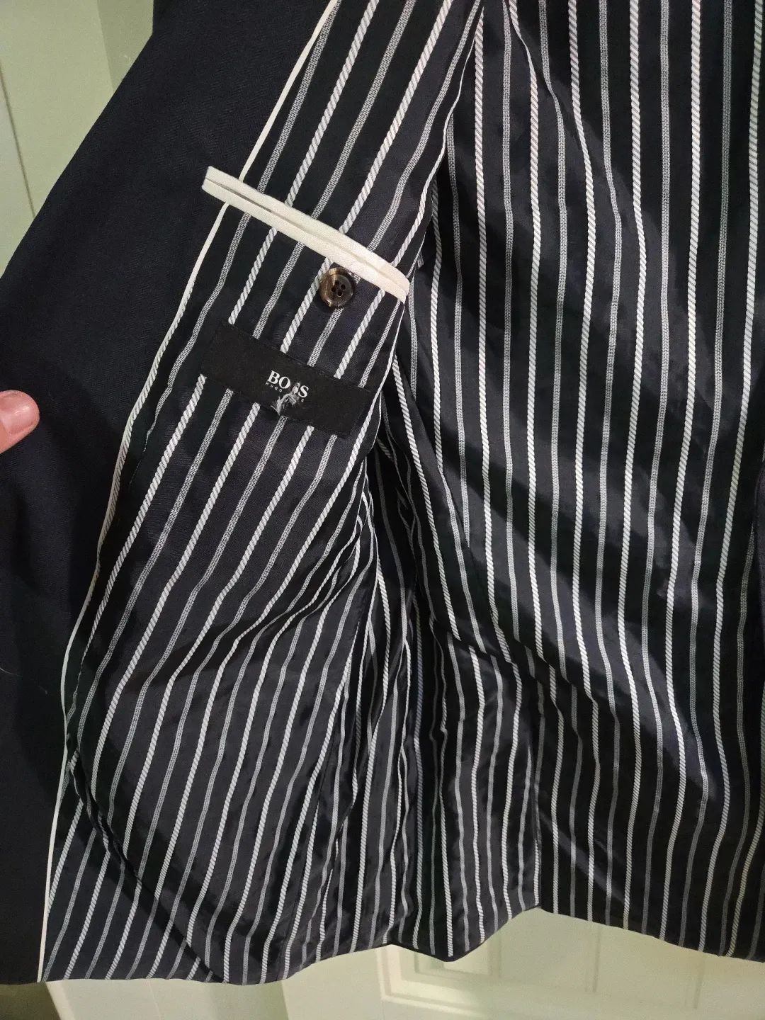 Here's a stylish navy blazer from Hugo Boss! It's in great condition and features a classic design with a striped lining. Perfect for adding a touch of sophistication to any outfit