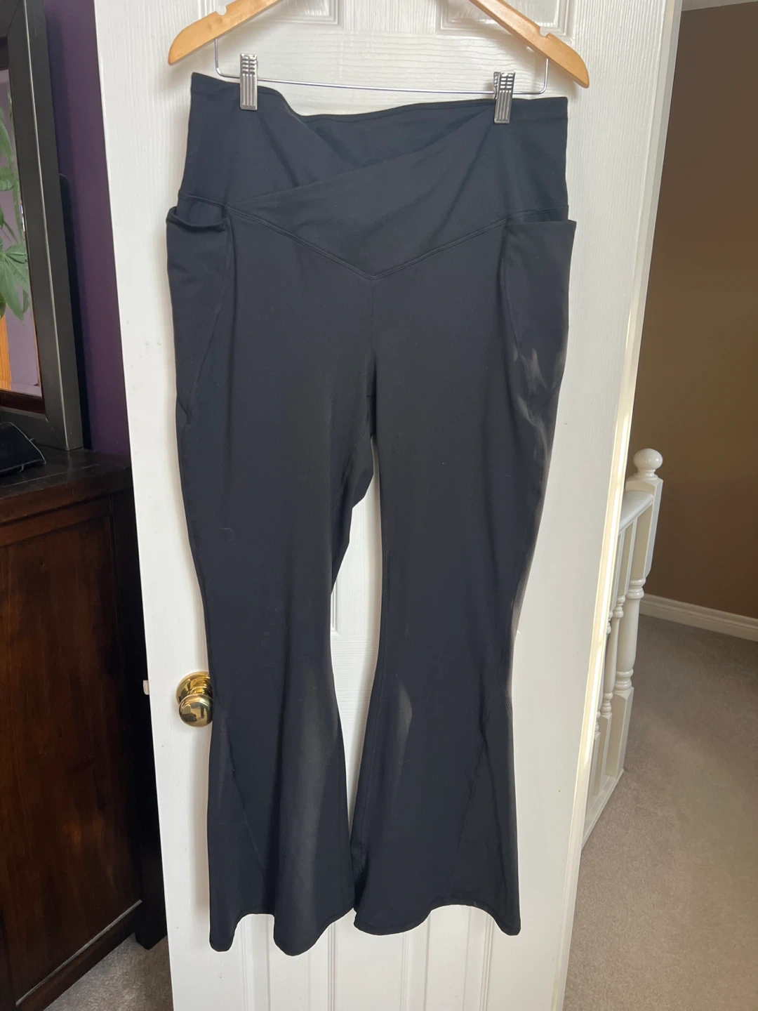 These Fabletics leggings are black with a flare leg style. They feature a comfortable V-waistband and two side pockets. Material is stretchy and good for workouts or casual wear.