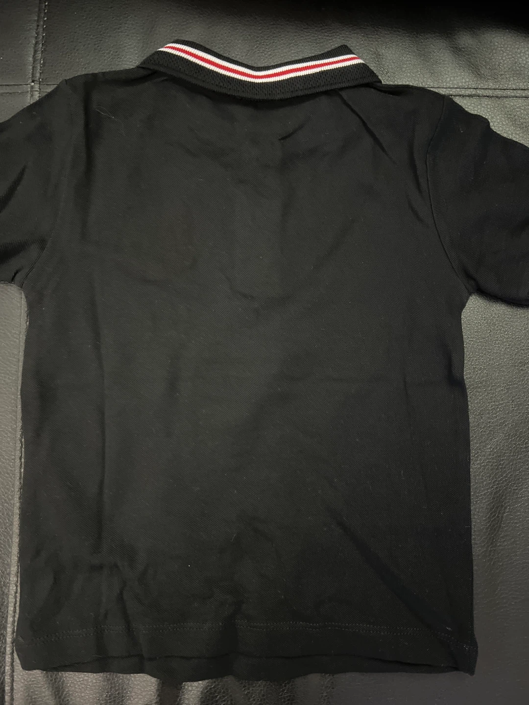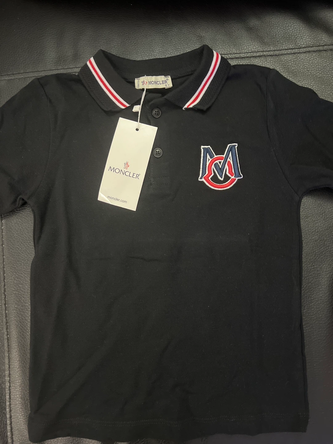 Selling a brand new Moncler kids polo shirt. It's black with a stylish red and white striped collar. Never worn and still has the tags attached!