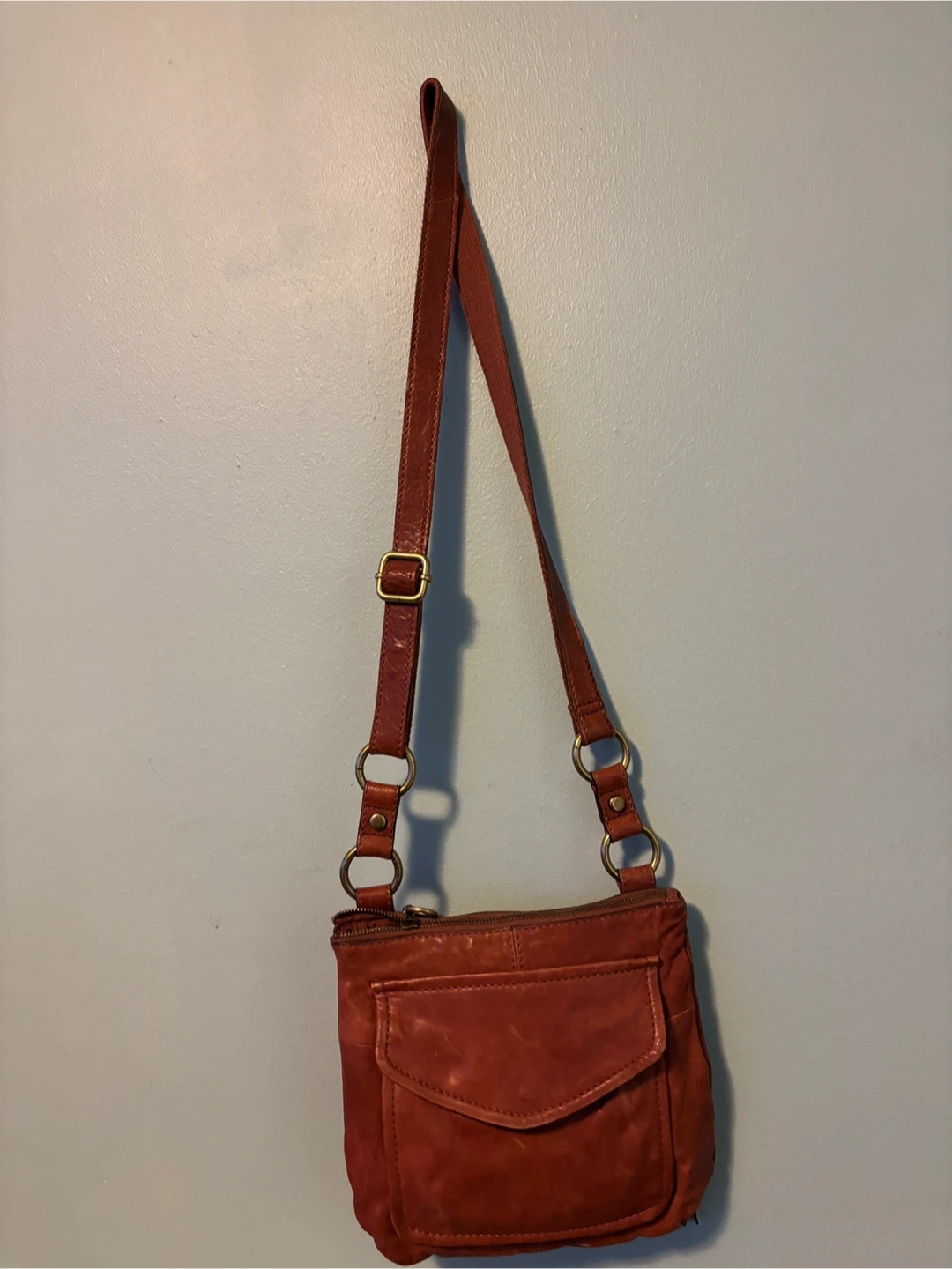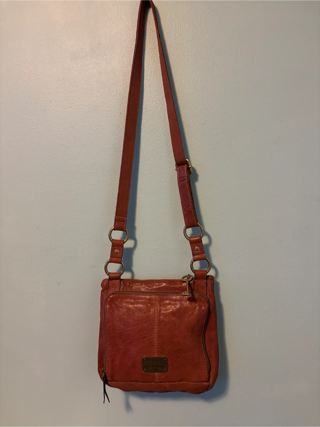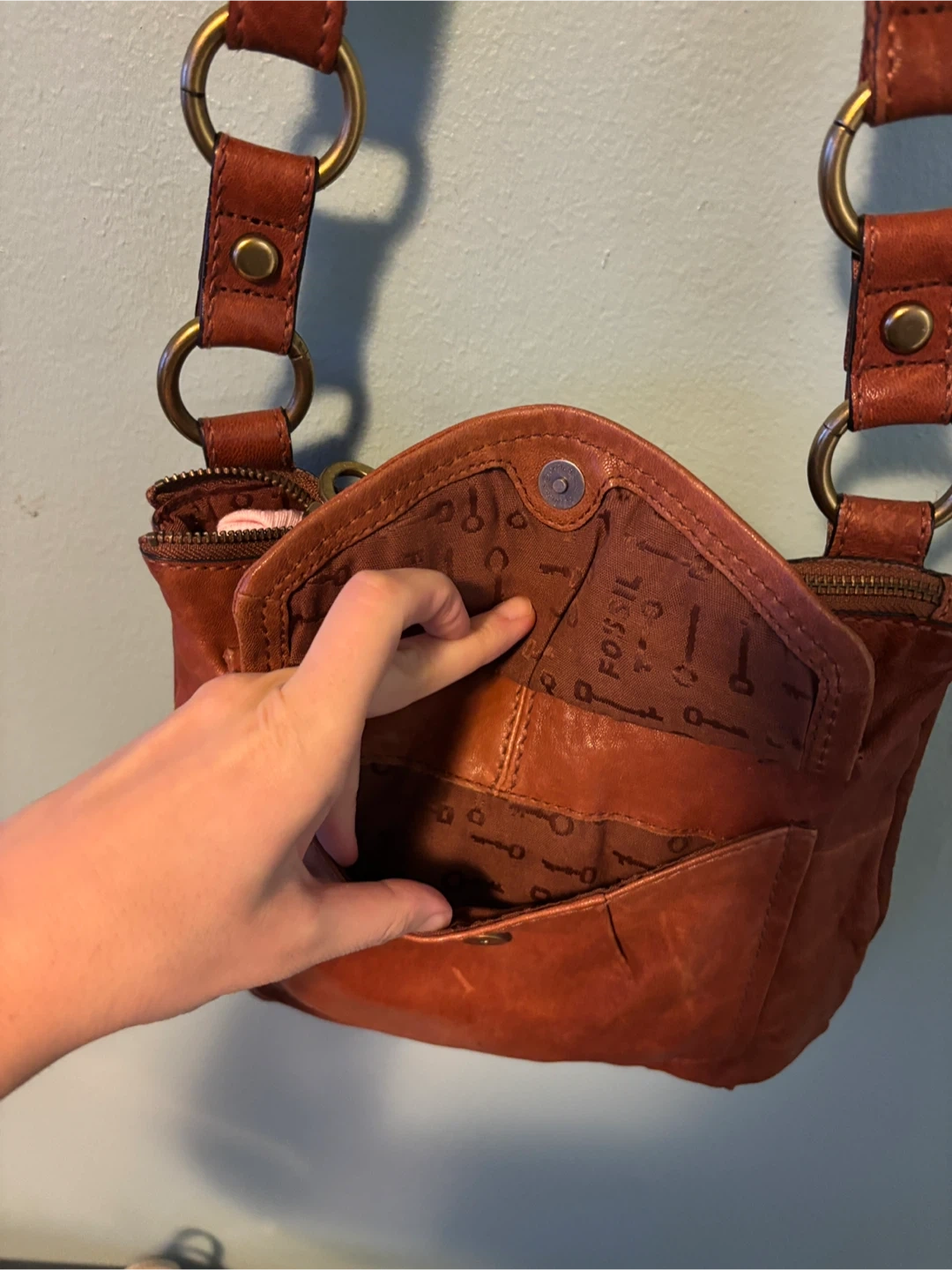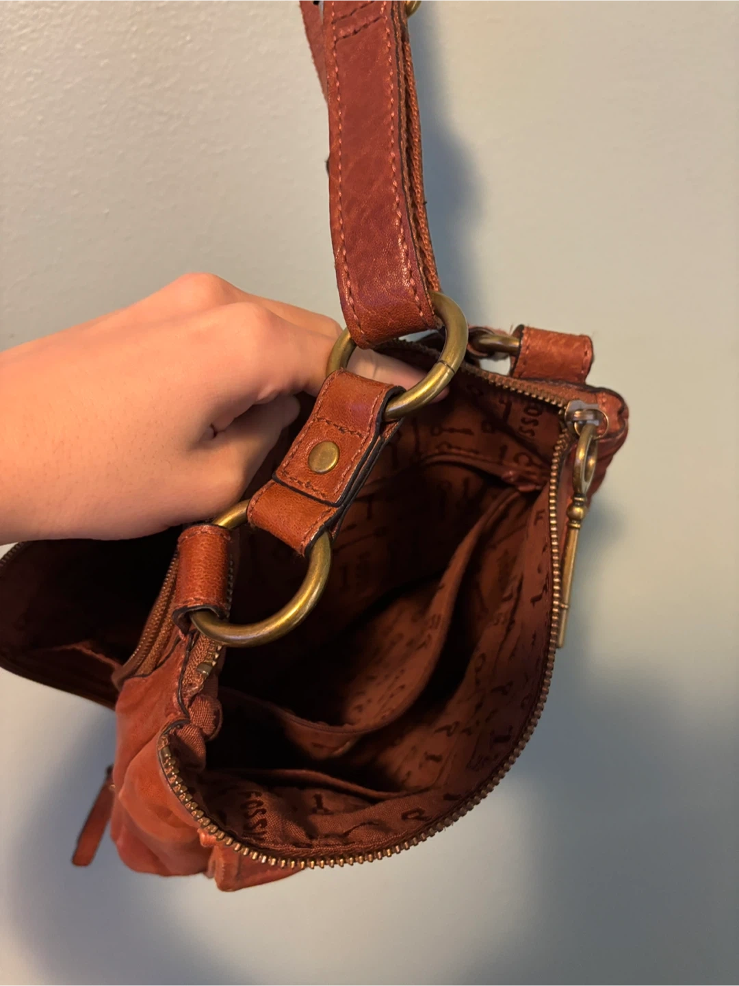 This is a brown leather crossbody bag by Fossil. It features a main zippered compartment and an exterior snap pocket. The interior lining has a key and Fossil logo pattern.