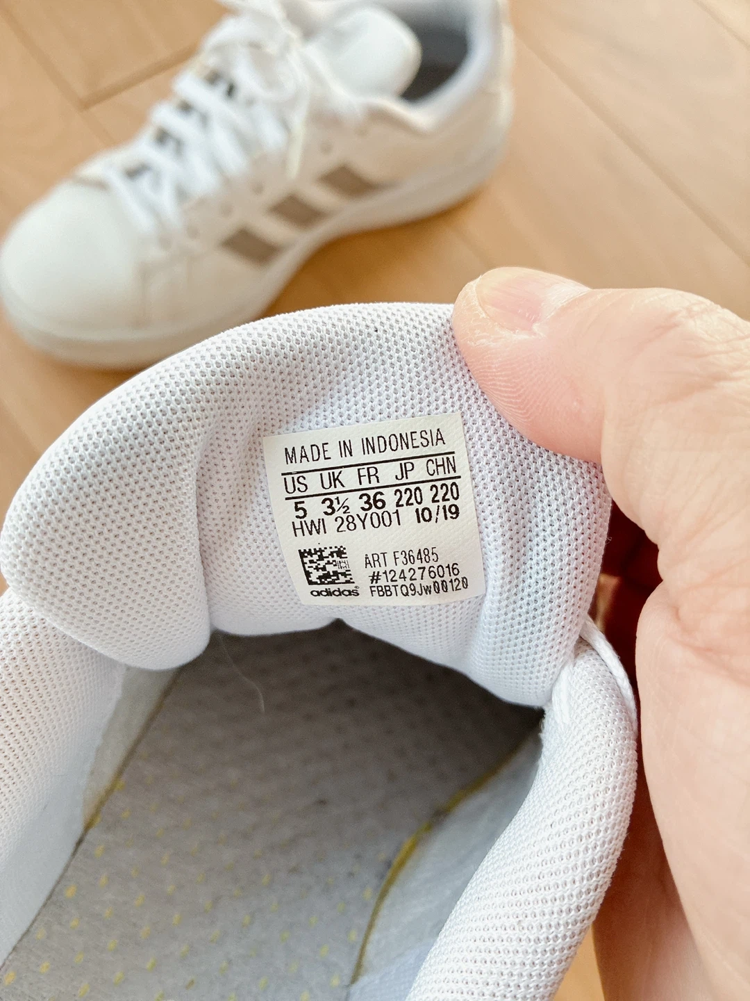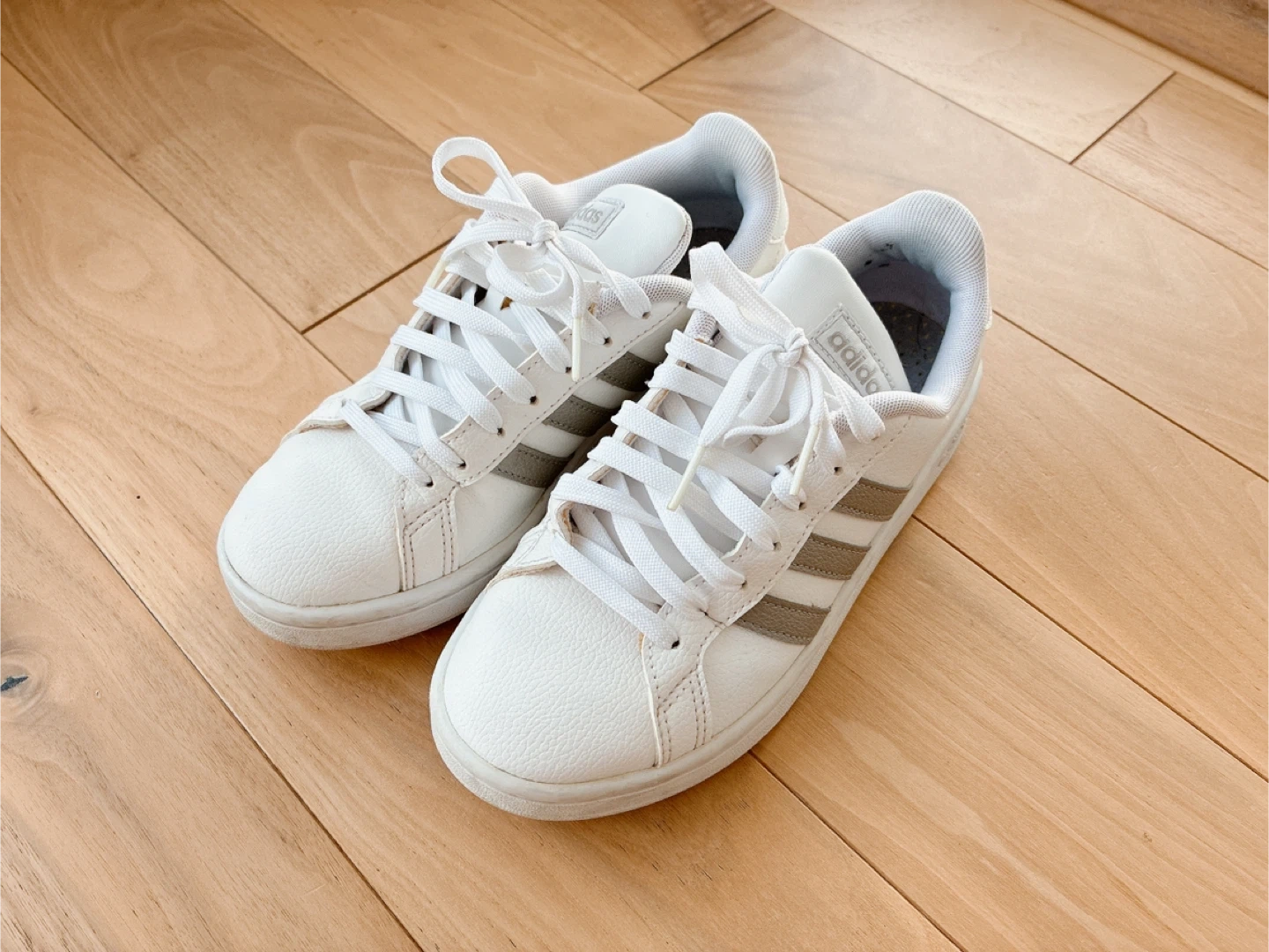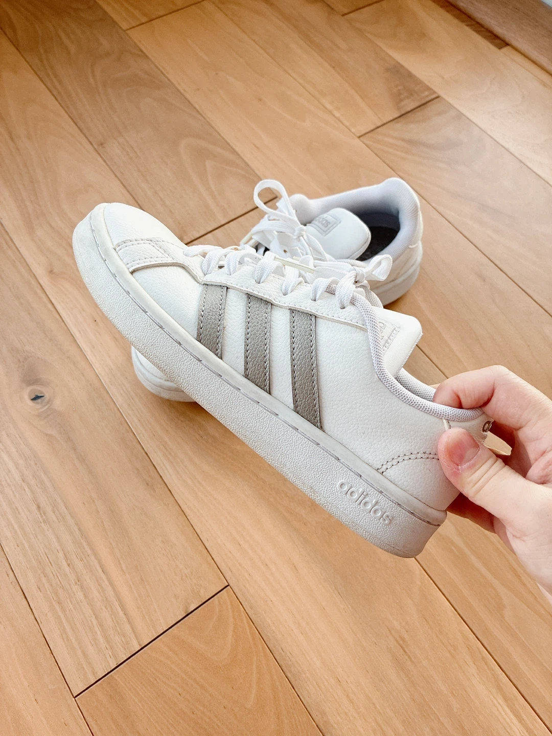 Selling a pair of Adidas Grand Court shoes in white with silver stripes. They are in great condition and are a size 5 (US). Perfect for everyday wear!