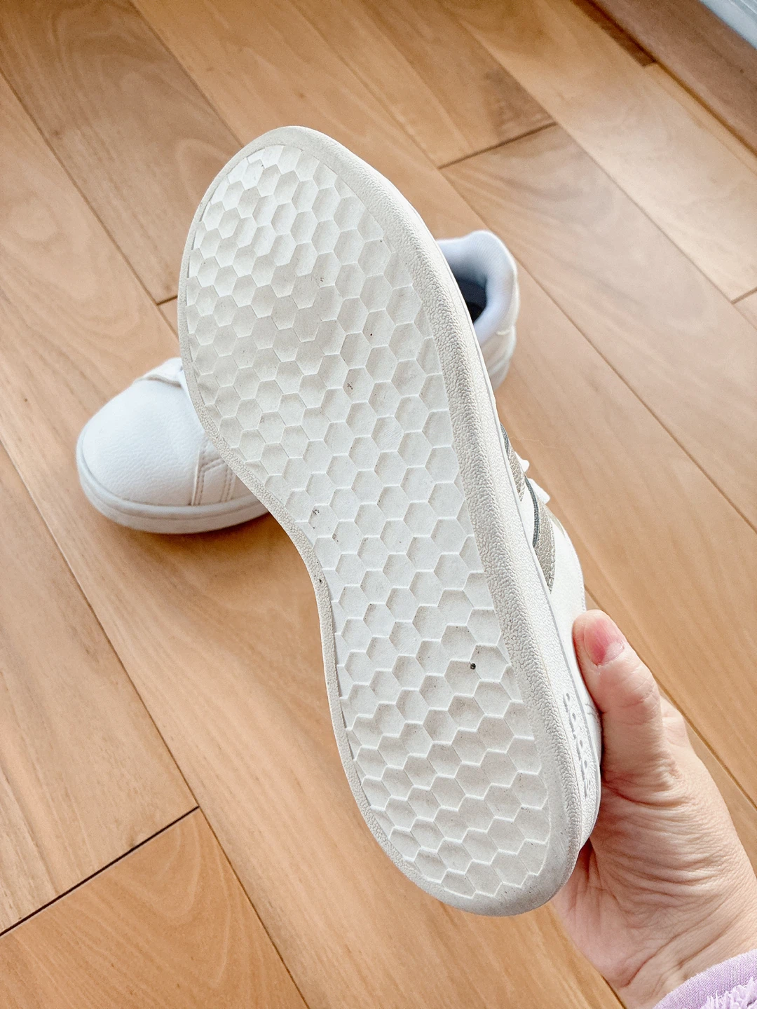 Selling a pair of Adidas Grand Court shoes in white with silver stripes. They are in great condition and are a size 5 (US). Perfect for everyday wear!