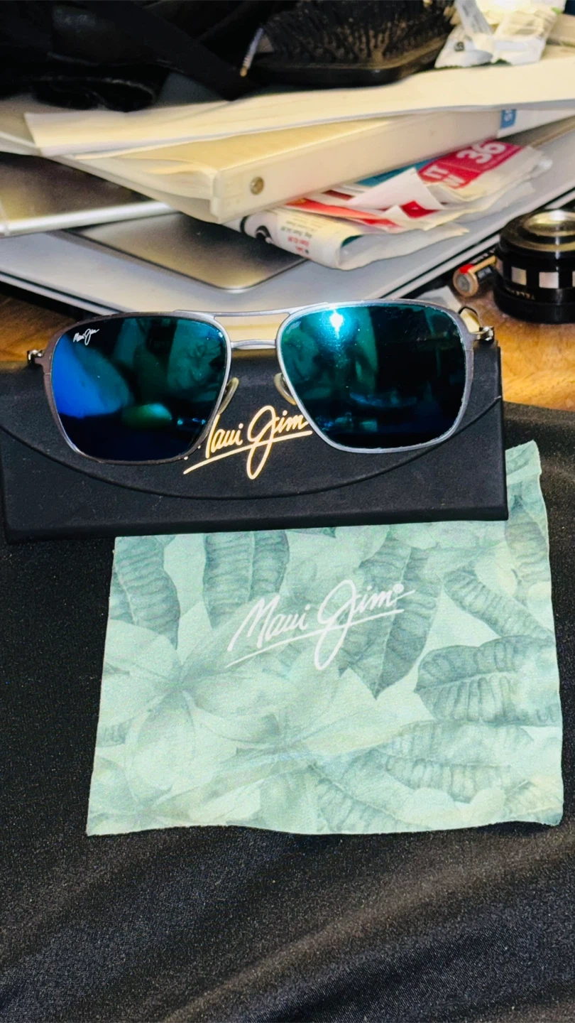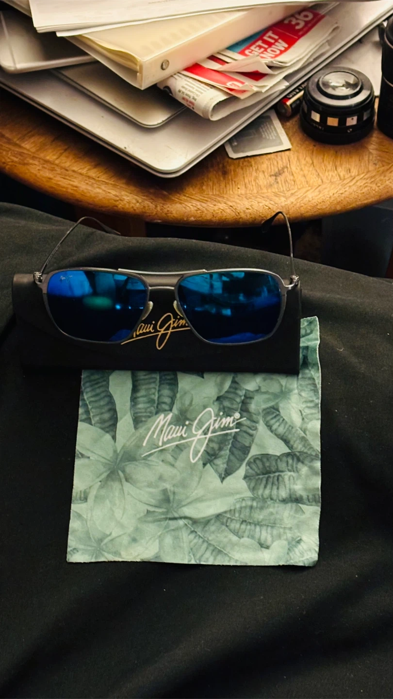 Maui Jim sunglasses with blue lenses. Comes with a protective case and a cleaning cloth, both featuring the Maui Jim logo. These shades offer great sun protection and a stylish look. No scratches.