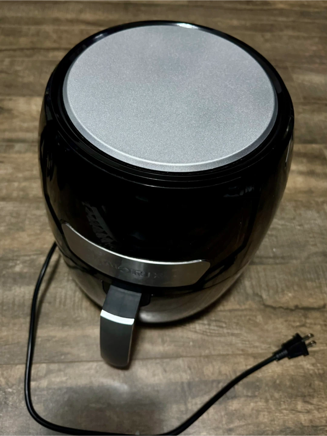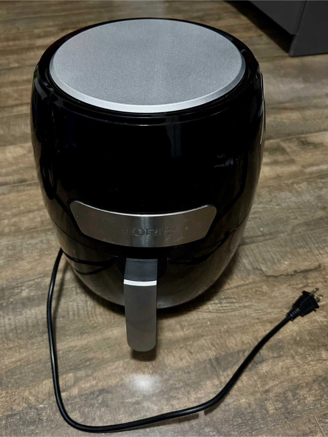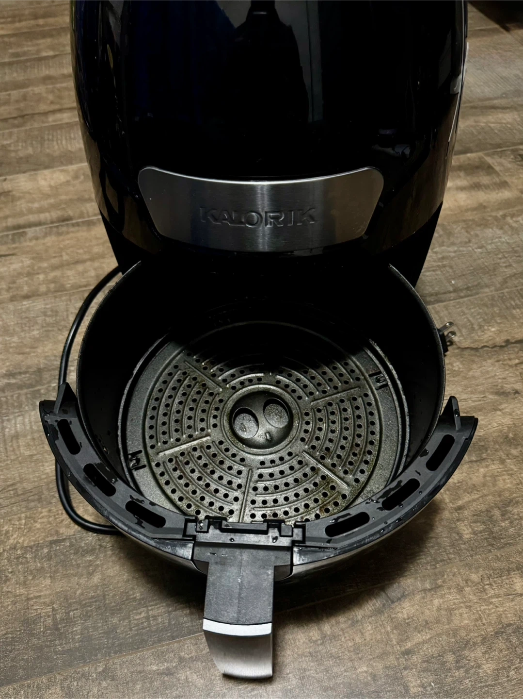 This is a black Kalorik air fryer. It's compact and efficient for quick meals. The basket pulls out for easy cleaning. No packaging just the product shown.